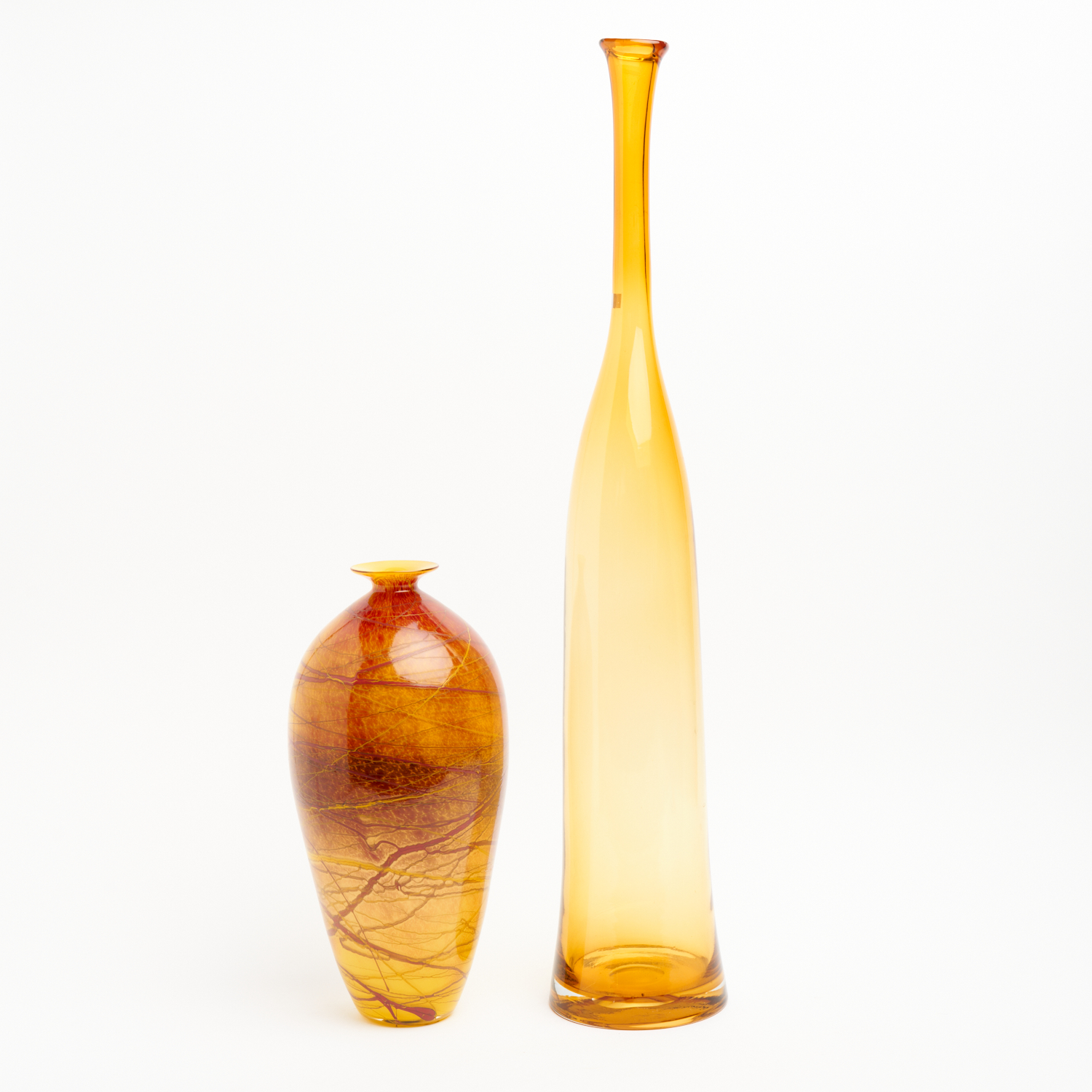 TWO ORANGE ART GLASS VASES, ONE MARKED 'MORTELL' TO THE UNDERSIDE H.80CM