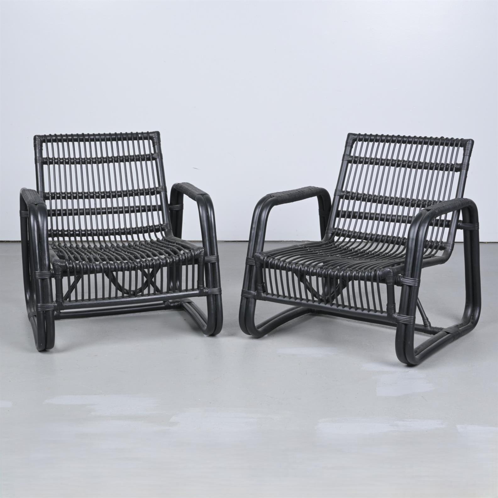 A PAIR OF LACQUERED CANE ARMCHAIRS (75H X 70W X 80D CM)