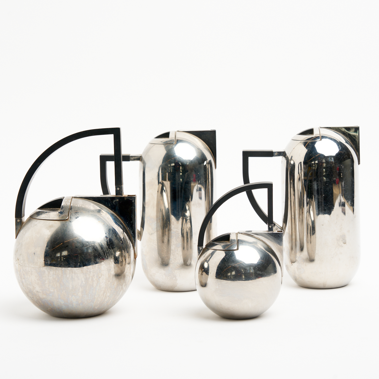 FOUR STAINLESS STEEL TEAPOTS BY OLIVER HEMMING H.21CM