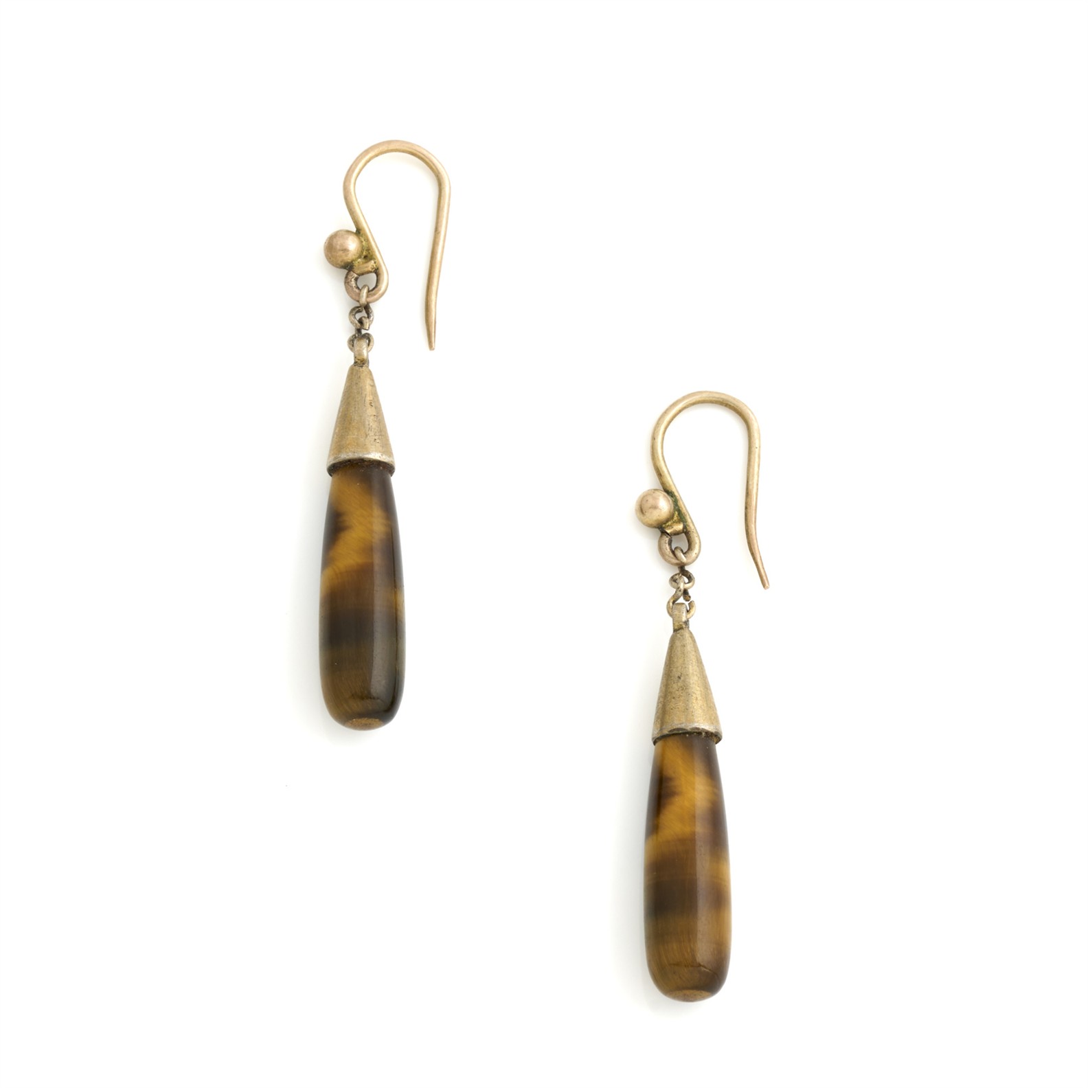 A PAIR OF TIGER'S EYE DROP EARRINGS IN GOLD PLATE, DROP LENGTH 45MM, TO SHEPHERD HOOK FITTINGS