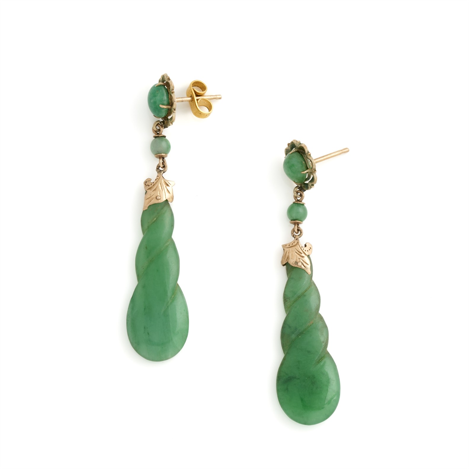 A PAIR OF JADE DROP EARRINGS IN 10CT GOLD, DROP LENGTH 50MM, TO POST AND BUTTERFLY FITTINGS, A/F (MISSING A BACKING)
