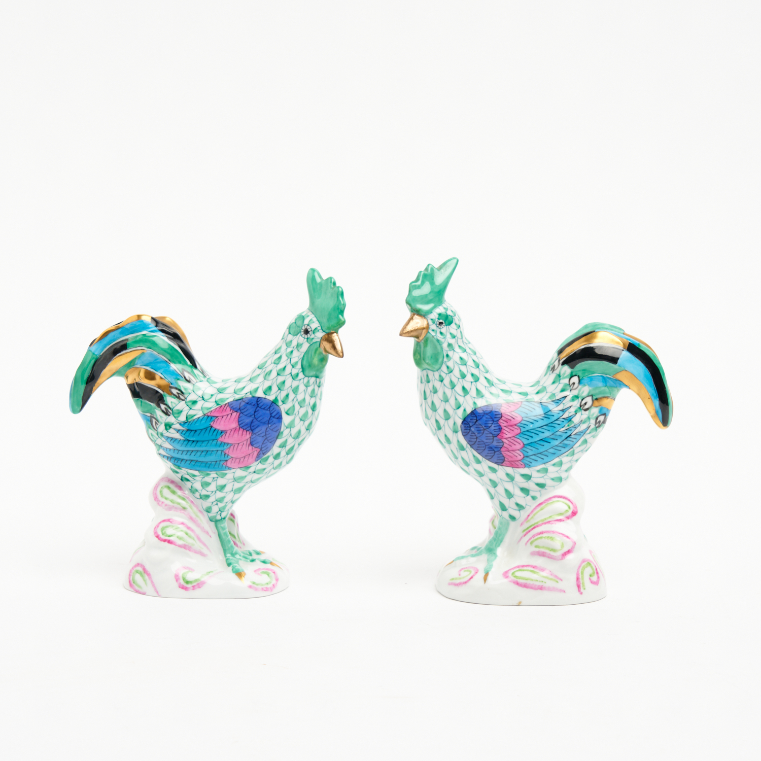 A PAIR OF HEREND FISHNET PORCELAIN ROOSTERS H.14CM