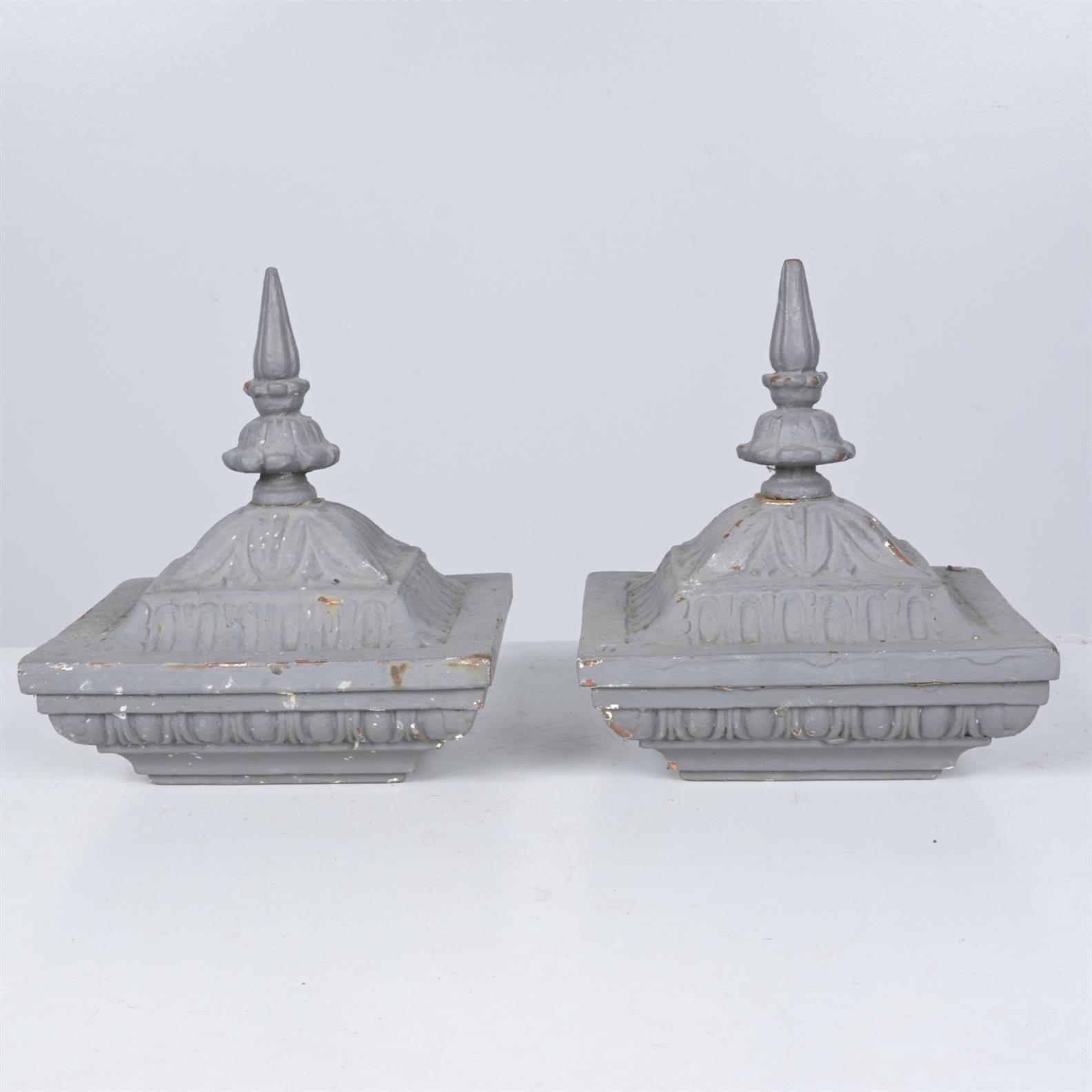 A PAIR OF CAST IRON FINIALS (33H X 28W X 28D CM)(THIS ITEM MUST BE REMOVED BY THE CUSTOMER OR CARRIERS AT THE CUSTOMER'S EXPENSE. LEONARD JOEL STAFF CANNOT ASSIST CARRYING THIS ITEM)
