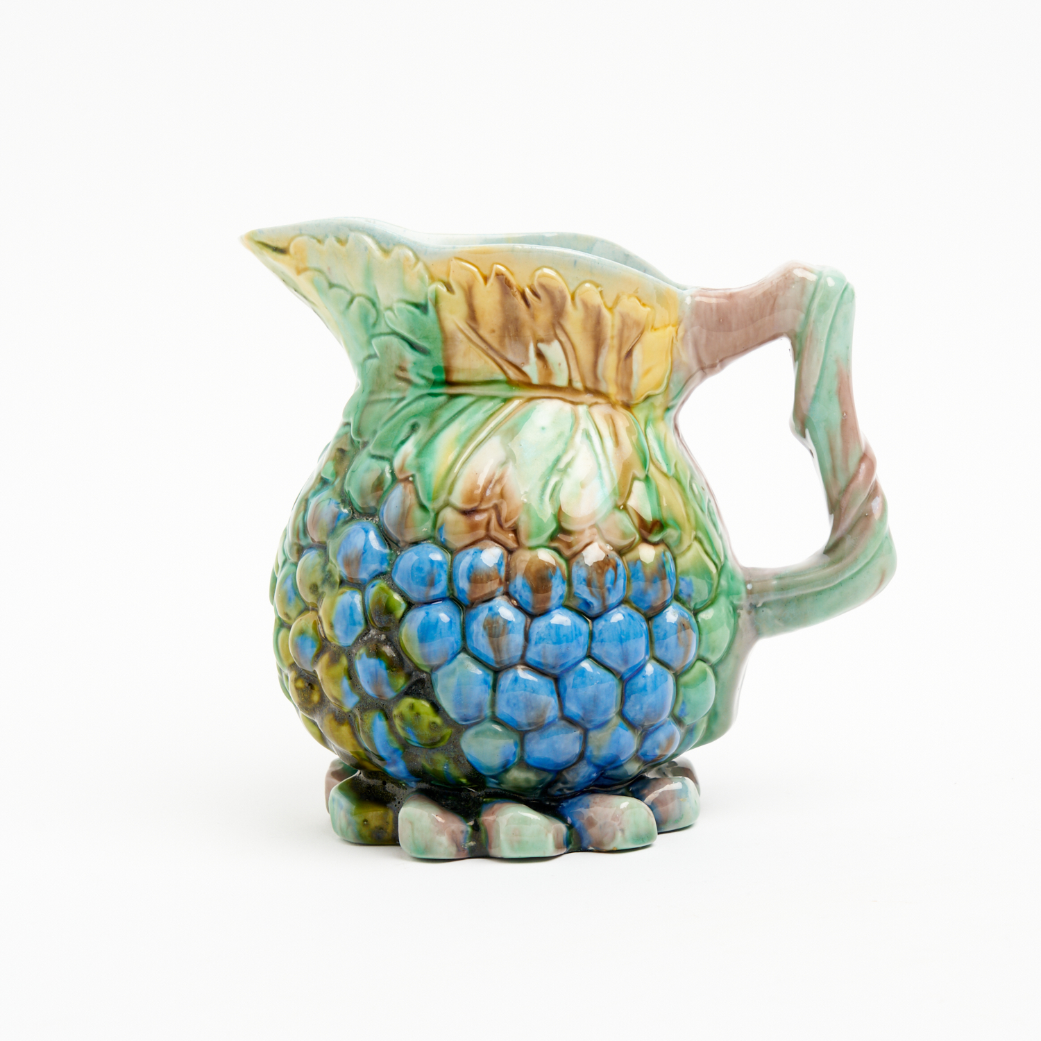 A VICTORIAN ADAMS & BROMLEY MAJOLICA GRAPE VINE PITCHER, IZ70, H.17.5CM