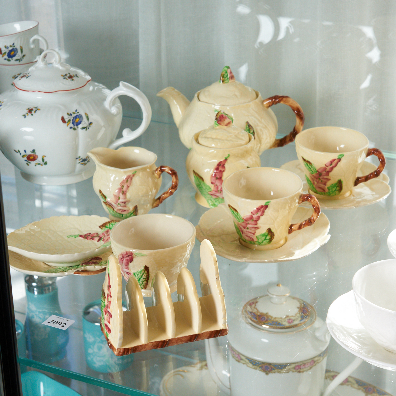 A CARLTON WARE ' FOXGLOVE' BREAKFAST SET FOR TWO INCLUDING TEAPOT, SUGAR BOWL, CREAMER, TOAST RACK, TWO CUPS AND SAUCERS AND SERVING DISHES L.19CM (LONGEST)