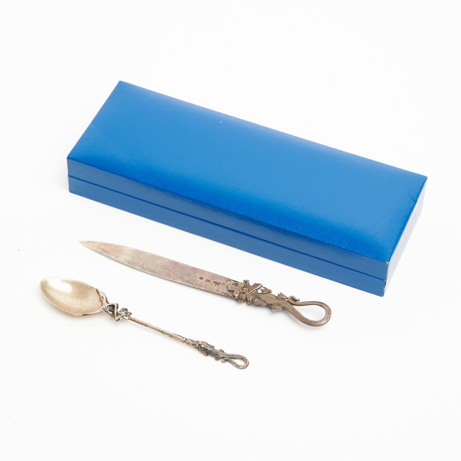 A STERLING SILVER GECKO TEASPOON AND LETTER OPENER BY ZYGMUMT LIBUCHA L.14CM (LONGEST)