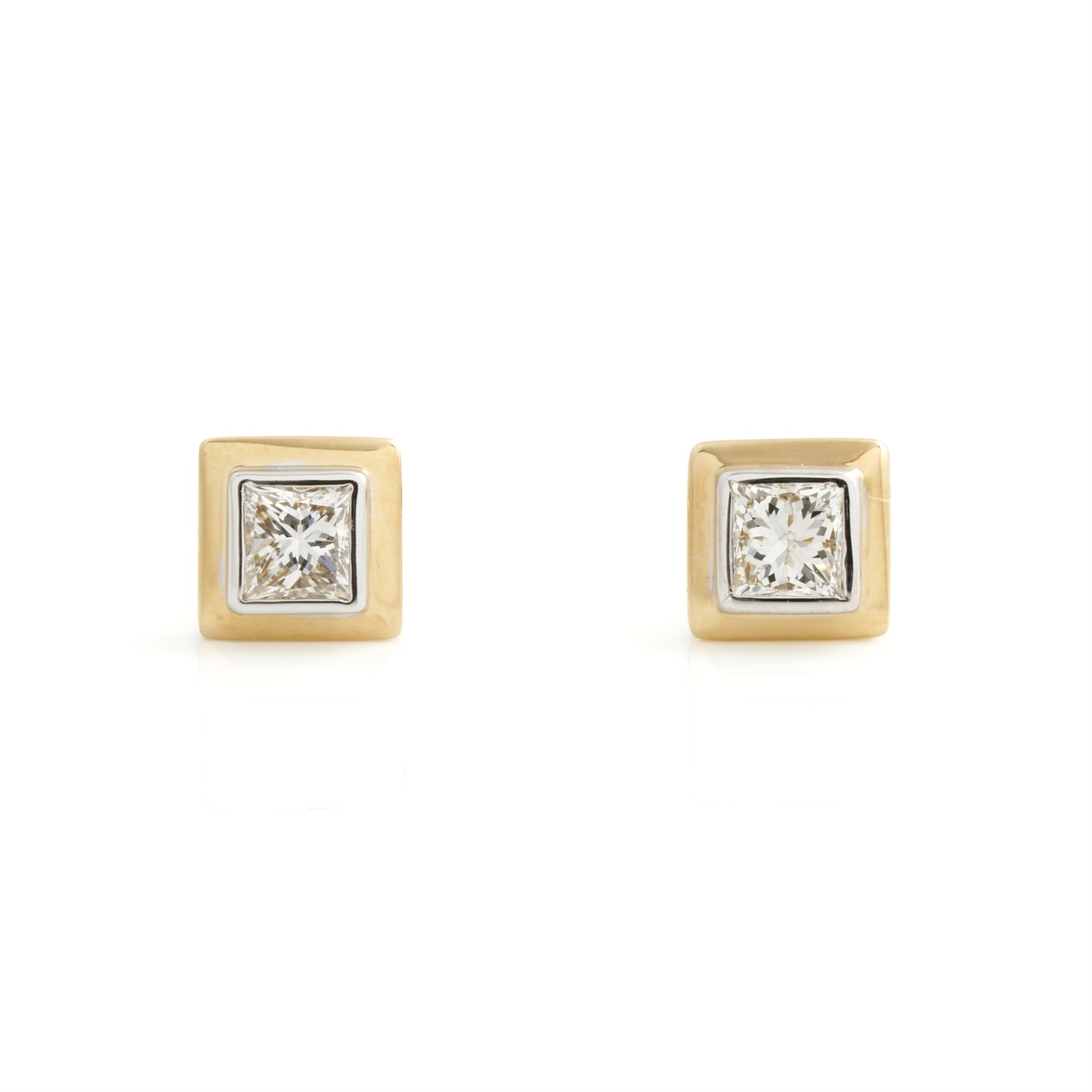 A PAIR OF PRINCESS CUT DIAMOND EARRINGS IN 18CT TWO-TONE GOLD, TO POST AND DISC FITTINGS, THE DIAMONDS TOTALLING 0.40CT, 2.01GMS