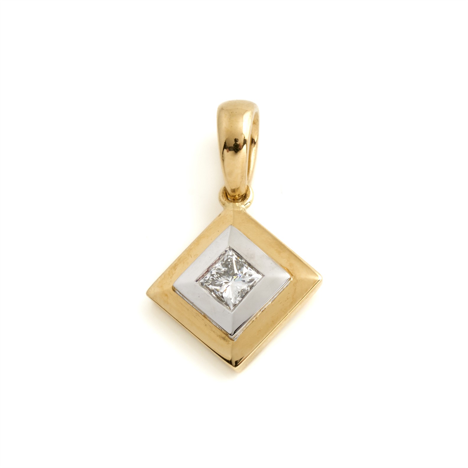 A PRINCESS CUT DIAMOND PENDANT IN 18CT TWO TONE GOLD, THE DIAMOND WEIGHING 0.25CT, 1.88GMS