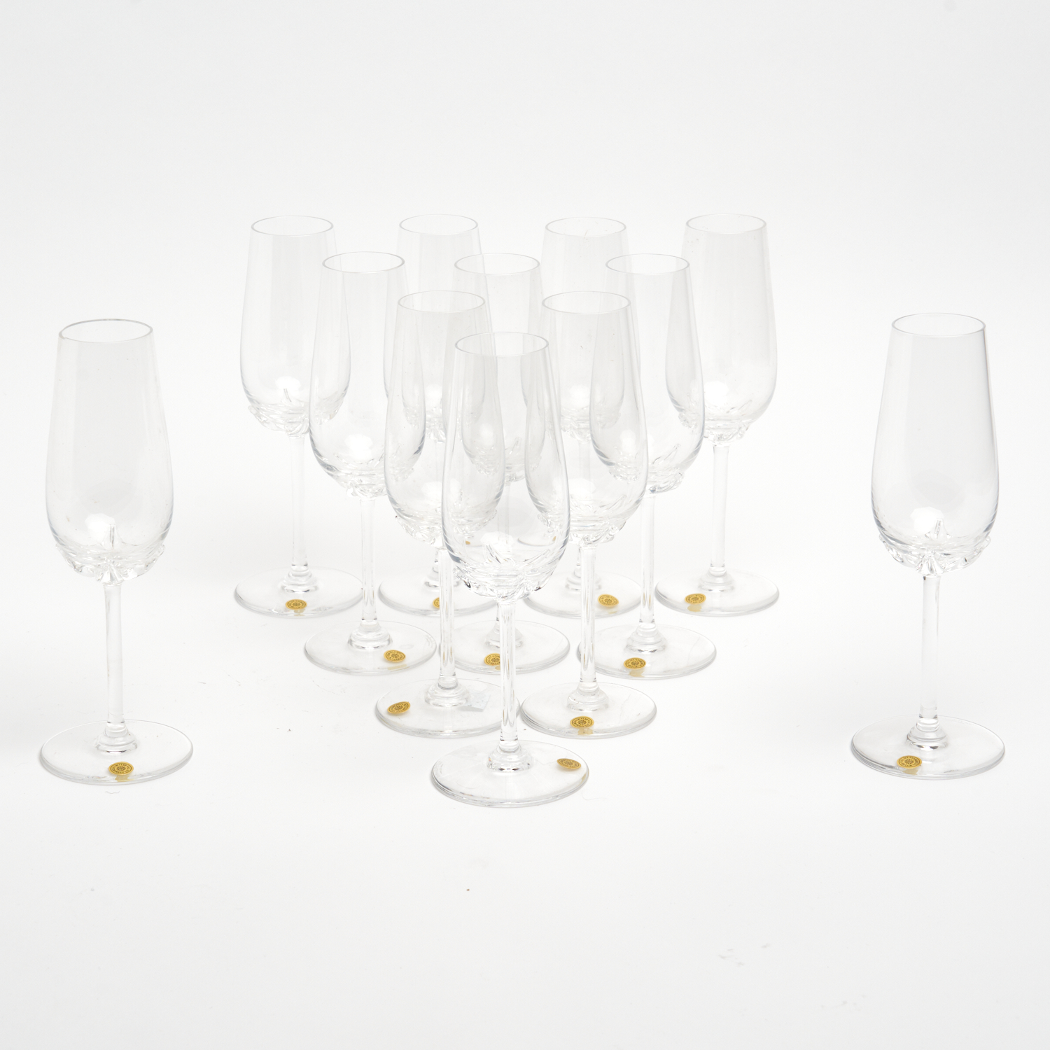 A SET OF TWELVE VAL ST LAMBERT CHAMPAGNE FLUTES, IN ORIGINAL BOXES L.16CM