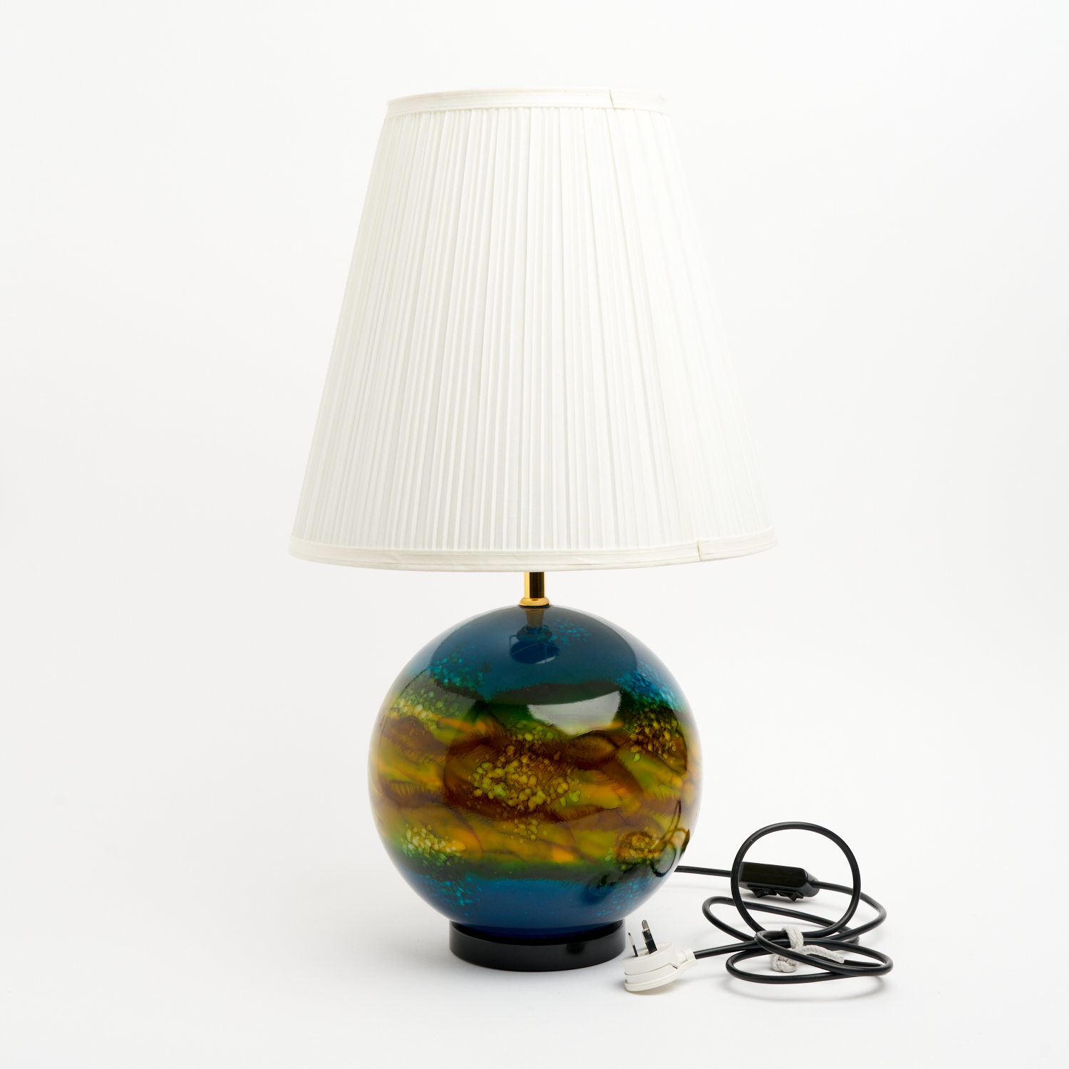 A MID-CENTURY SPHERICAL GLASS TABLE LAMP IN TONES OF OCHRES AND BLUE