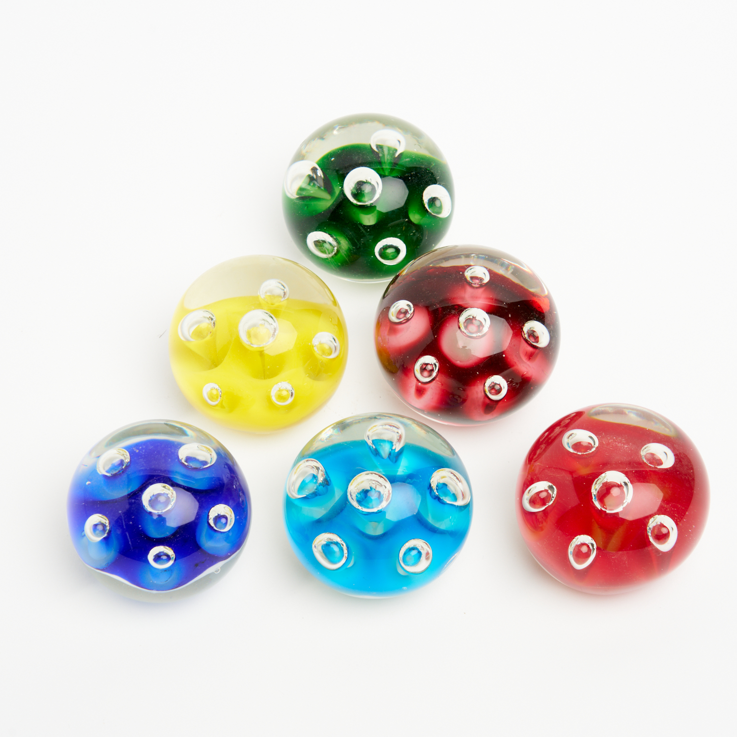 A SET OF SIX VINTAGE MURANO GLASS PAPERWEIGHTS IN HARLEQUIN COLOURS AND WITH CONTROLLED BUBBLES DIA.6CM