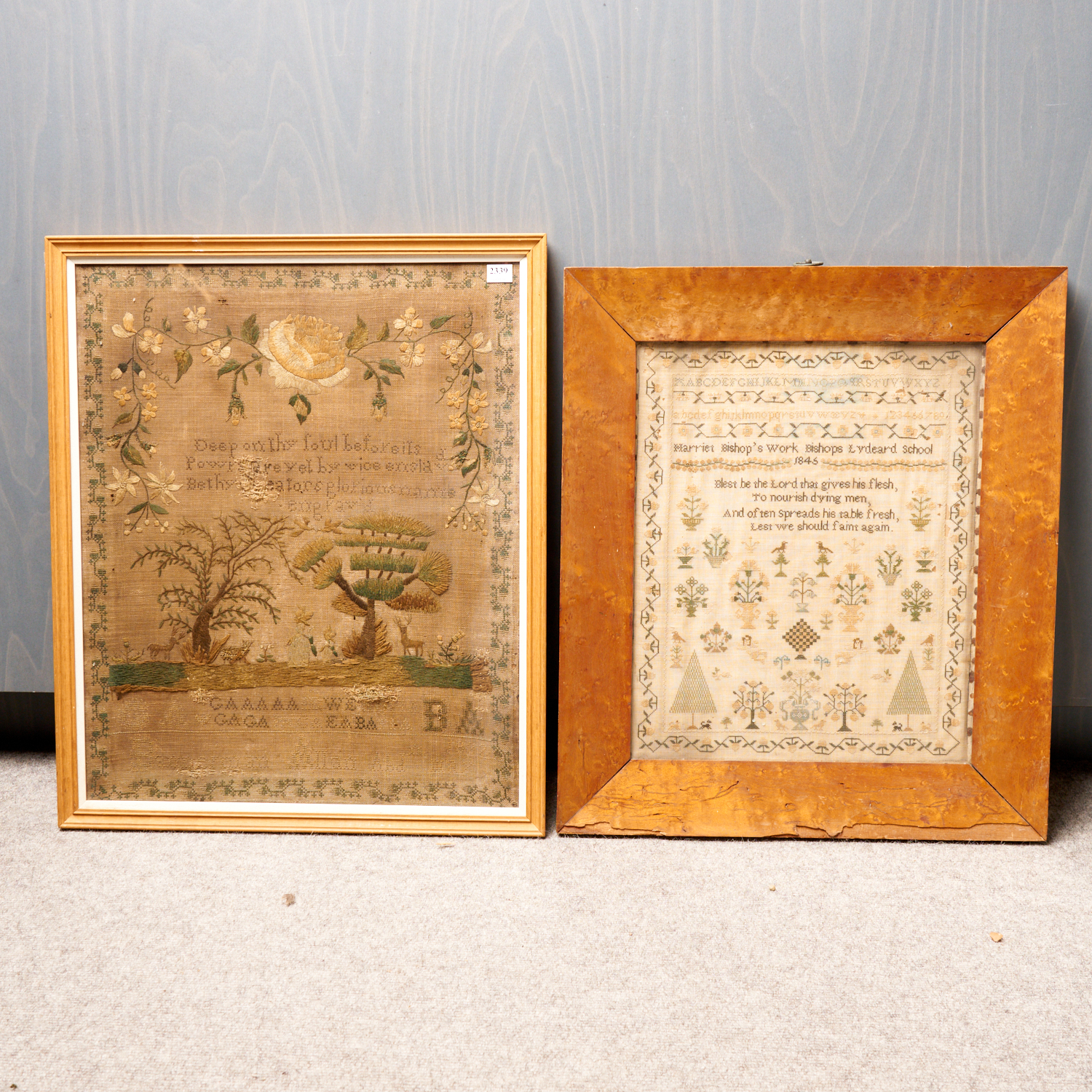 TWO FRAMED ANTIQUE SAMPLERS (A/F) 60 X 50CM (LARGEST)