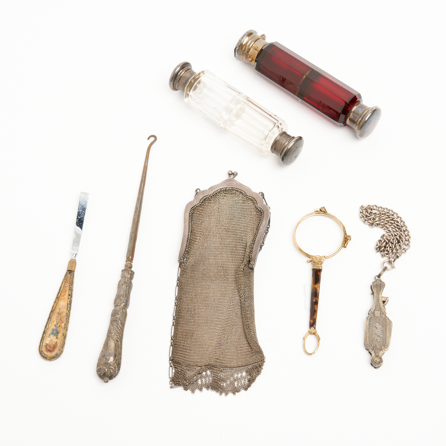 A COLLECTION OF DECORATIVE ITEMS INCLUDING A SMALL STERLING SILVER PURSE, TWO PERFUME FLASKS (ONE STERLING MOUNTED), A FAUX TORTOISESHELL MAGNIFYING GLASS, AND A SILVER GLOVE HOOK