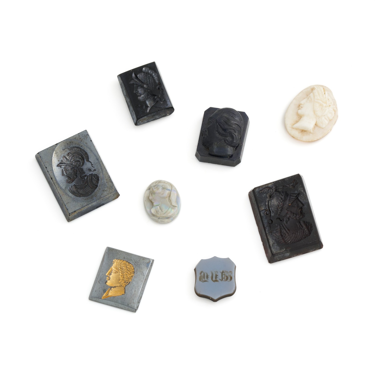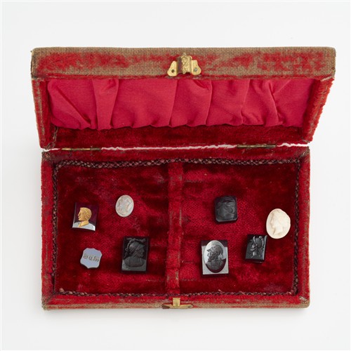 A COLLECTION OF EIGHT ANTIQUE CARVED CAMEOS AND INTAGLIOS, COMPRISED OF VARIOUS MATERIALS SUCH AS SHELL, GLASS, QUARTZ AND ONYX, ACCOMPANIED BY A VELVET AND SILK BOX