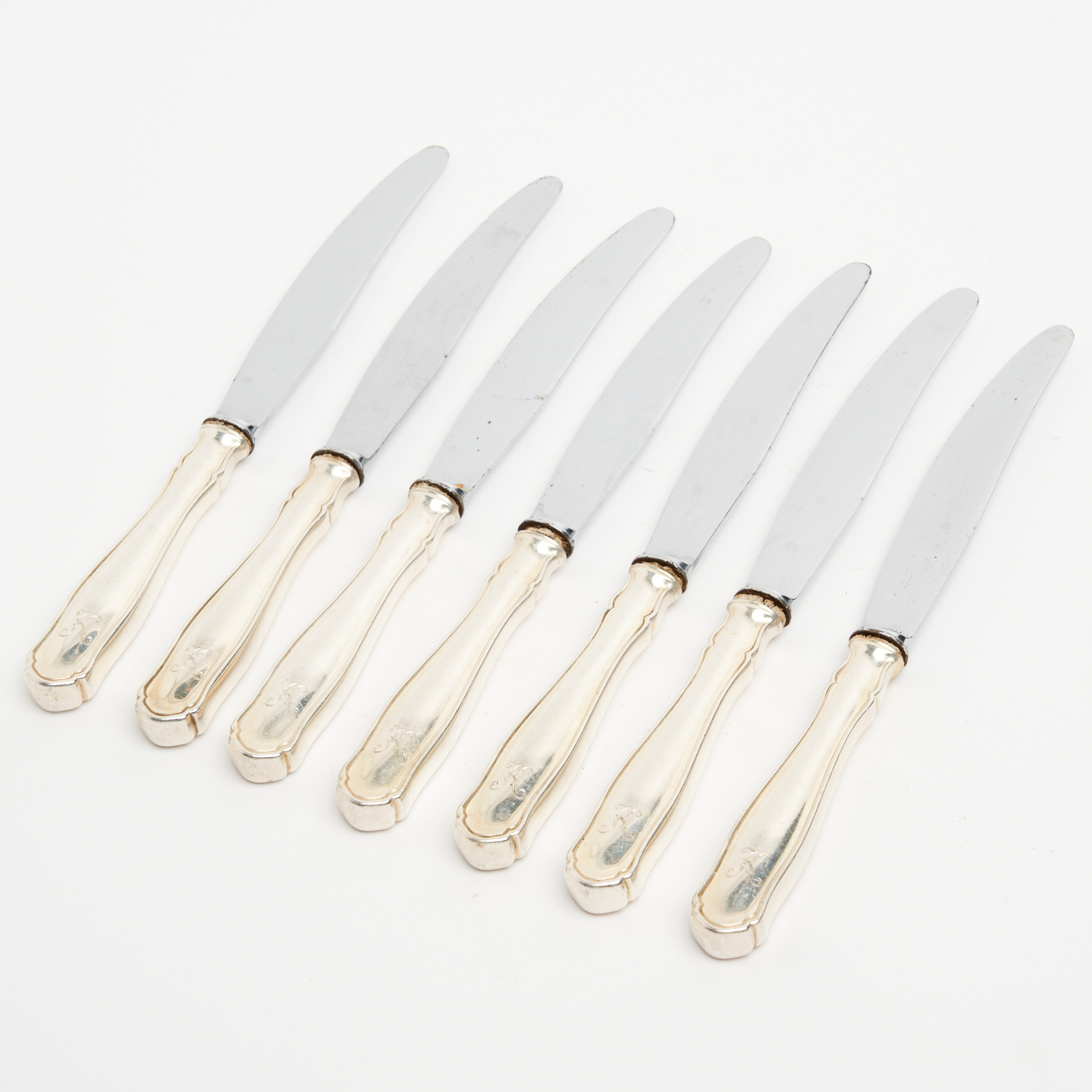 A SET OF SEVEN 800 SILVER HANDLED KNIVES L.25.5CM