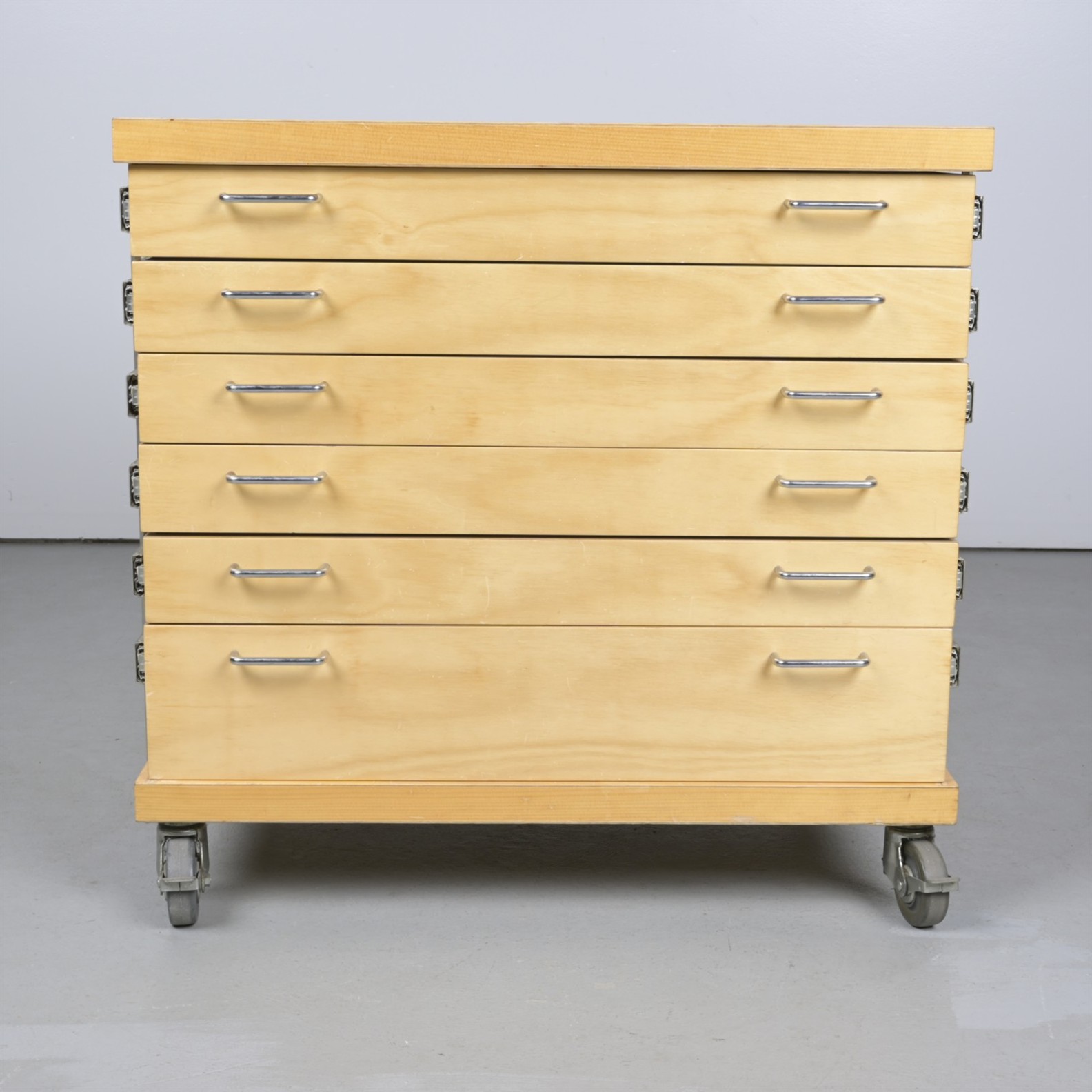 A SET OF BIRCH PLAN DRAWERS BY PIERRE AND CHARLOTTE, c.EARLY 2000S. (92H X 87W X 85D CM)(THIS ITEM MUST BE REMOVED BY THE CUSTOMER OR CARRIERS AT THE CUSTOMER'S EXPENSE. LEONARD JOEL STAFF CANNOT ASSIST CARRYING THIS ITEM)