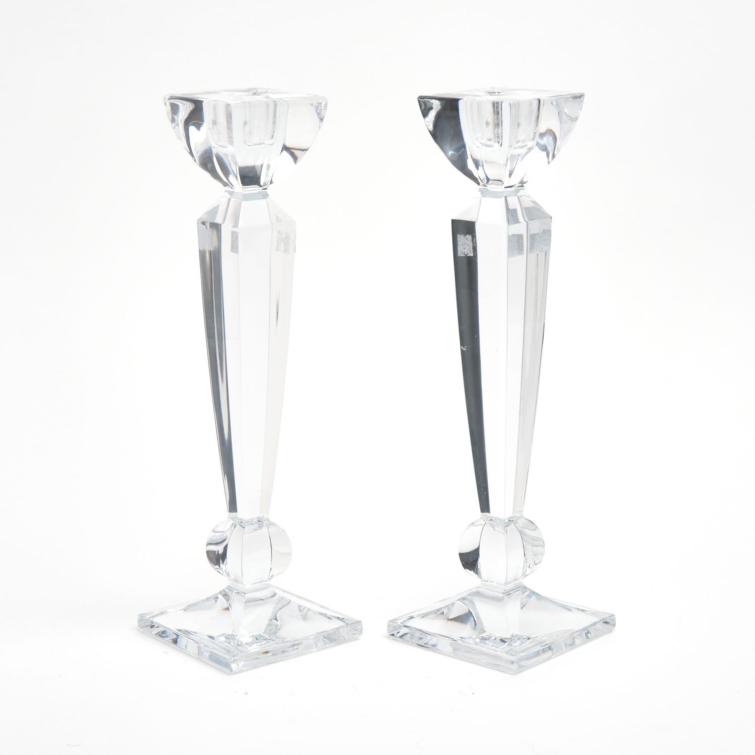 A PAIR OF VINTAGE HEAVY CUT CRYSTAL SQUARE FORM CANDLESTICKS H.31CM