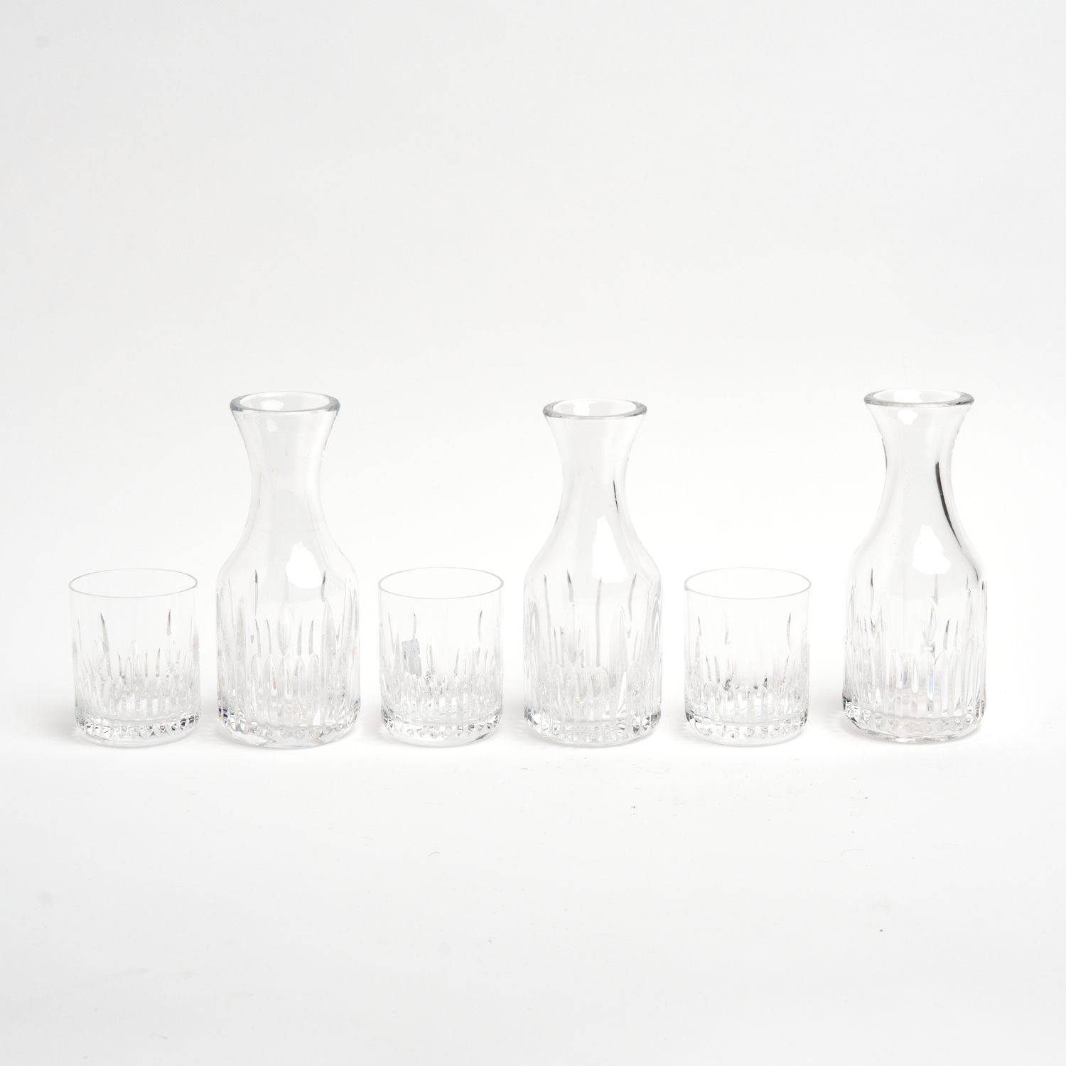 A SET OF THREE IRISH WATERFORD CRYSTAL CUT CARAFES AND TUMBLERS H.19CM