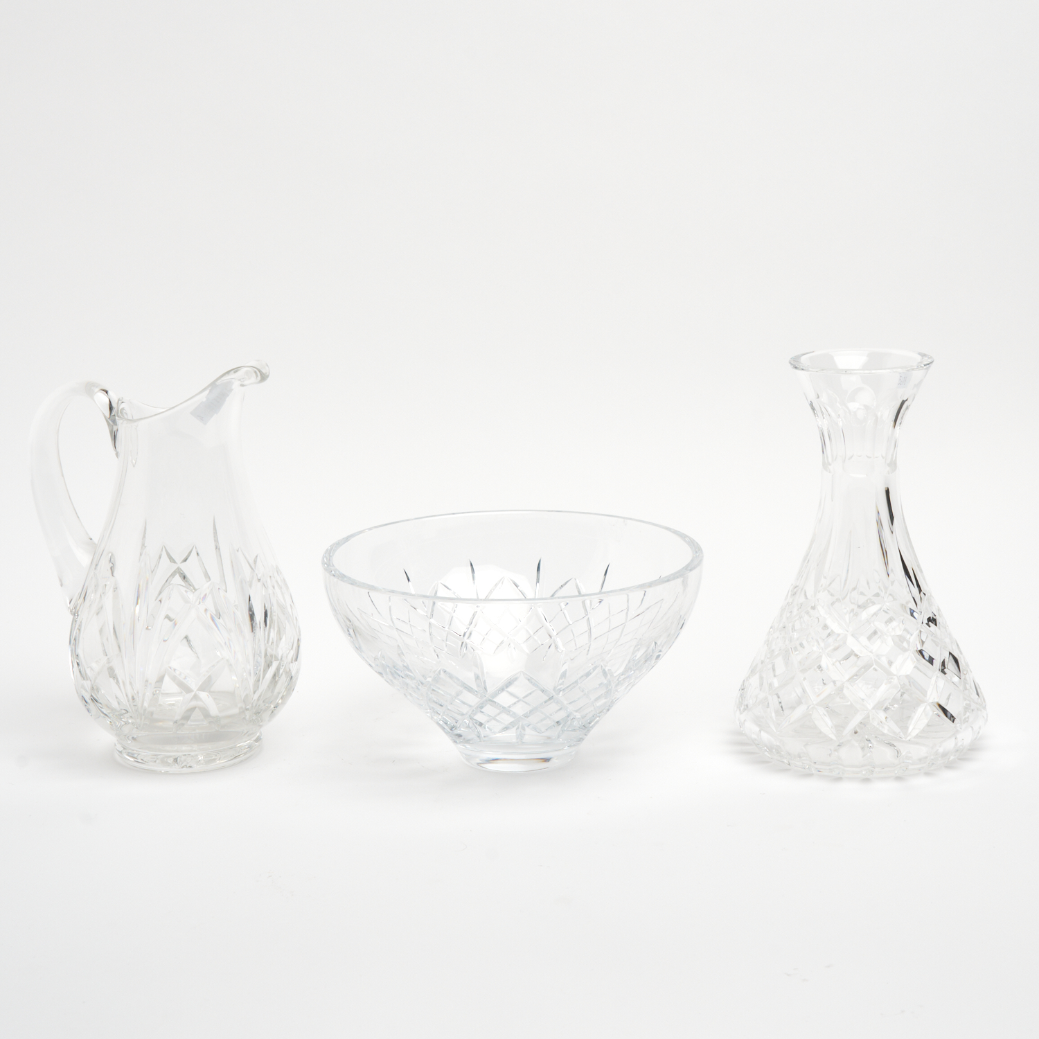 THREE PIECES OF WATERFORD CRYSTAL INCLUDING A JUG, BOWL AND CARAFE DIA.22CM