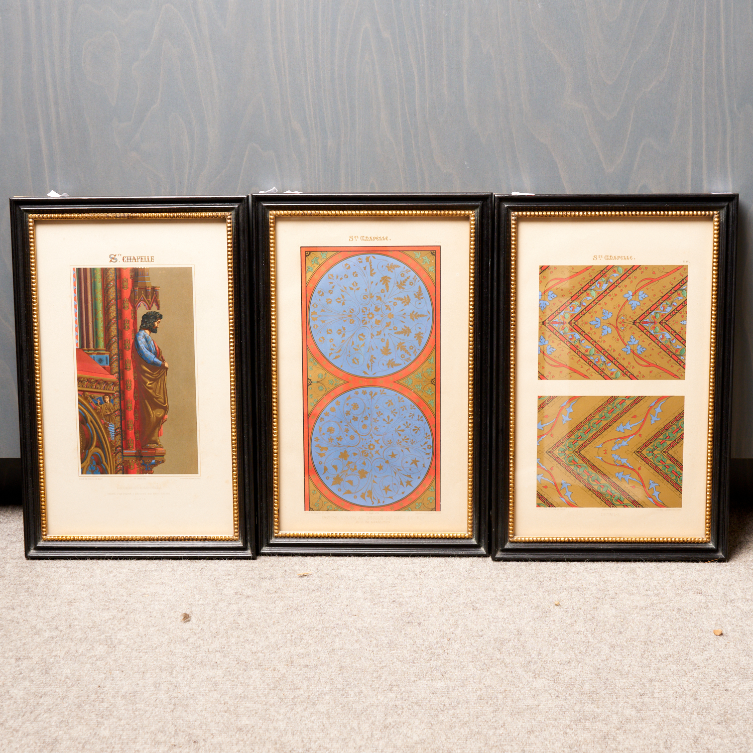 THREE FRAMED HAND COLOURED ILLUSTRATIONS OF IMAGES FROM THE SAINTE-CHAPELLE IN PARIS 47 x 31CM (FRAME)