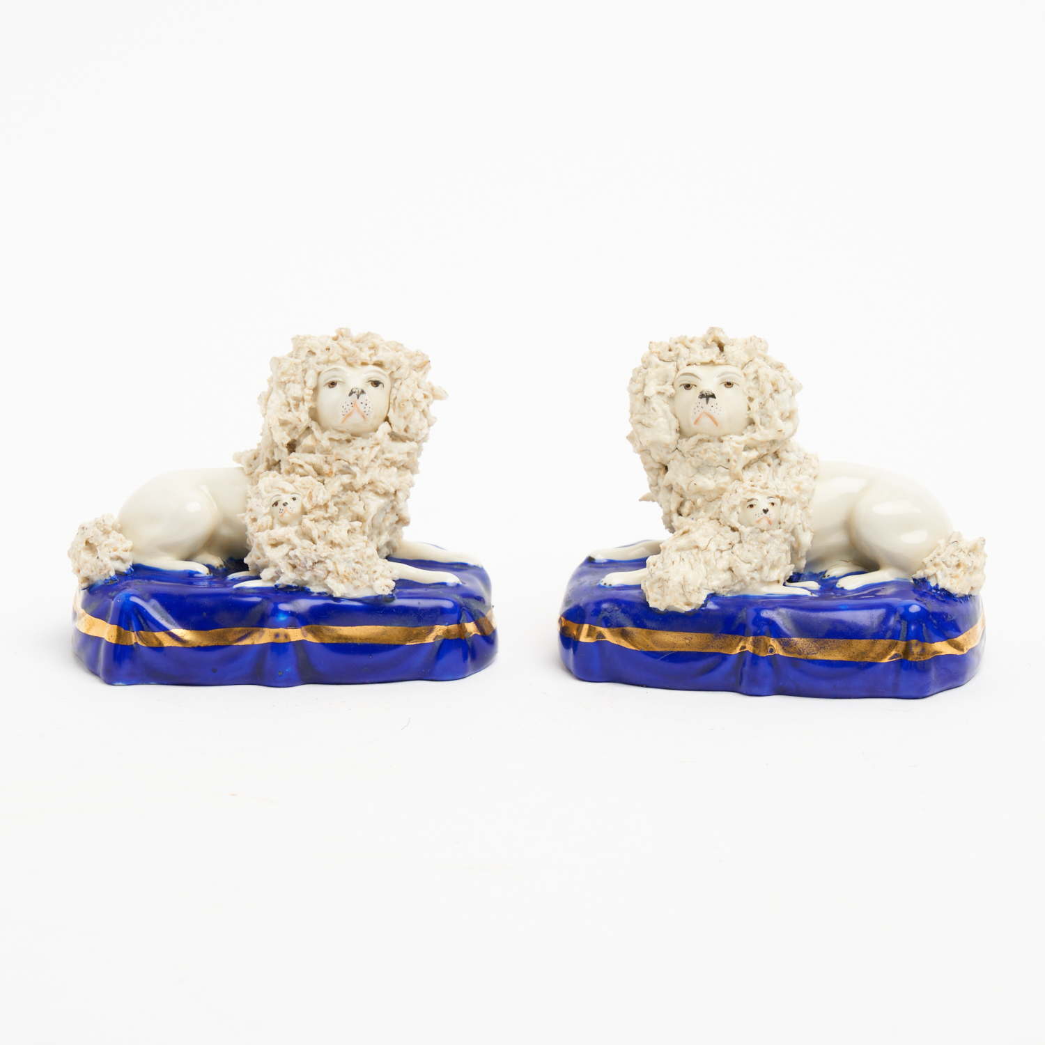 A PAIR OF EARLY 19TH CENTURY POODLE AND PUPPY FIGURAL GROUPS, PROBABLY STAFFORDSHIRE H.8CM