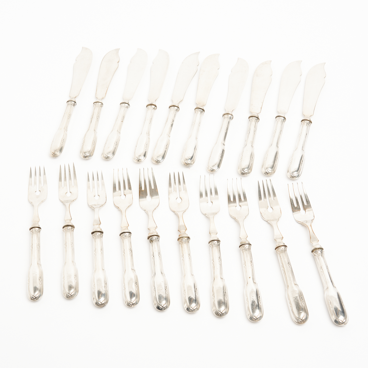 A 10 PIECE SETTING OF EUROPEAN 800 SILVER HANDLED FISH KNIVES AND FORKS H.20CM