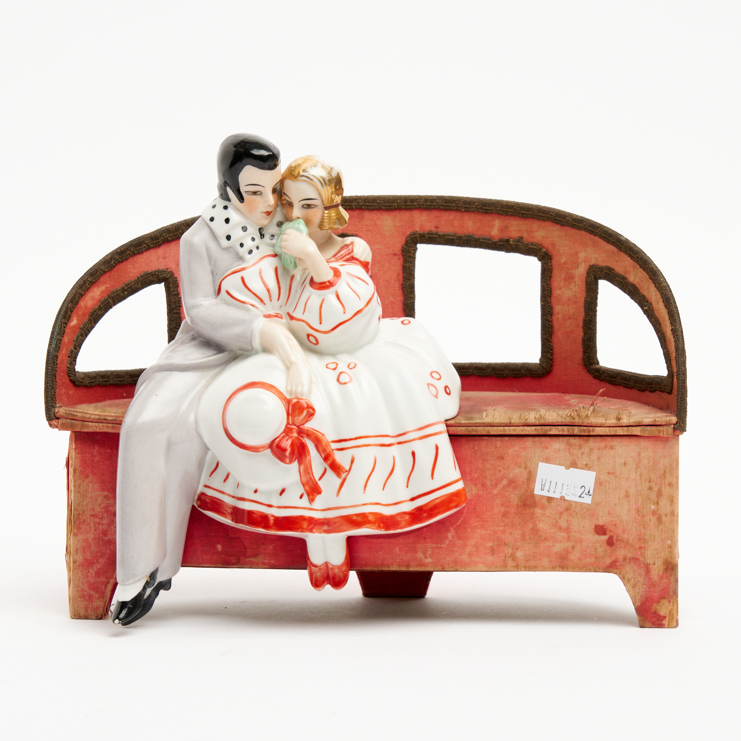 A FRENCH HAND PAINTED CERAMIC FIGURAL AND PAPIER MACHE JEWELLERY CASKET W.25CM