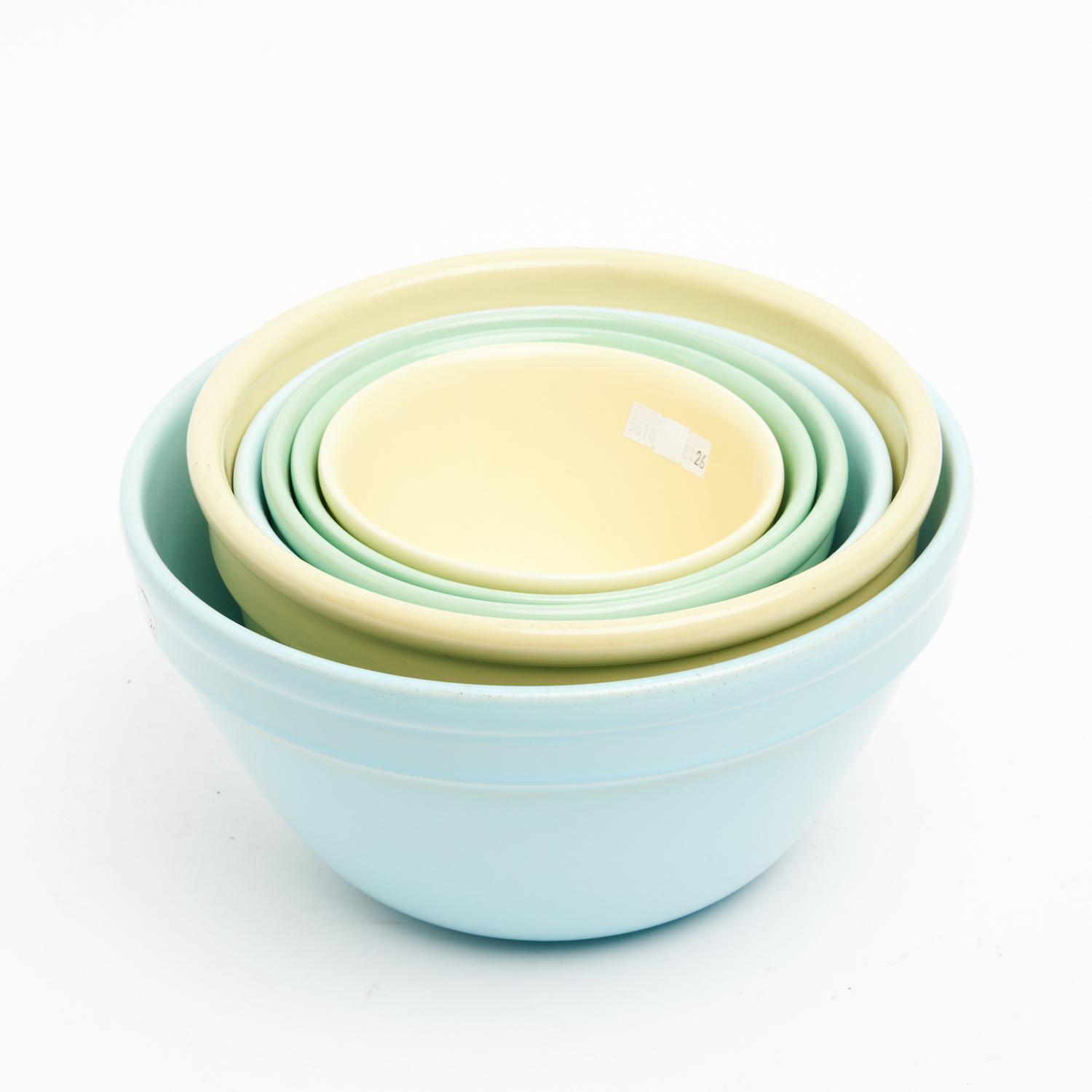 A GRADUATED SET OF SIX HARLEQUIN COLOURED FOWLER WARE AUSTRALIAN POTTERY MIXING BOWLS W.28CM
