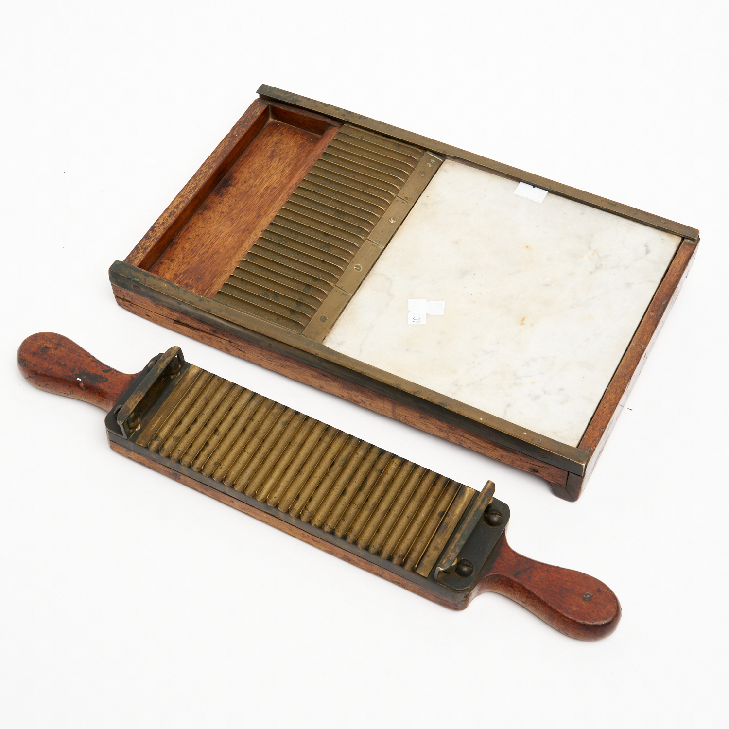 AN ANTIQUE WOODEN, BRASS AND MARBLE PILL PRESS MAKER W.34CM
