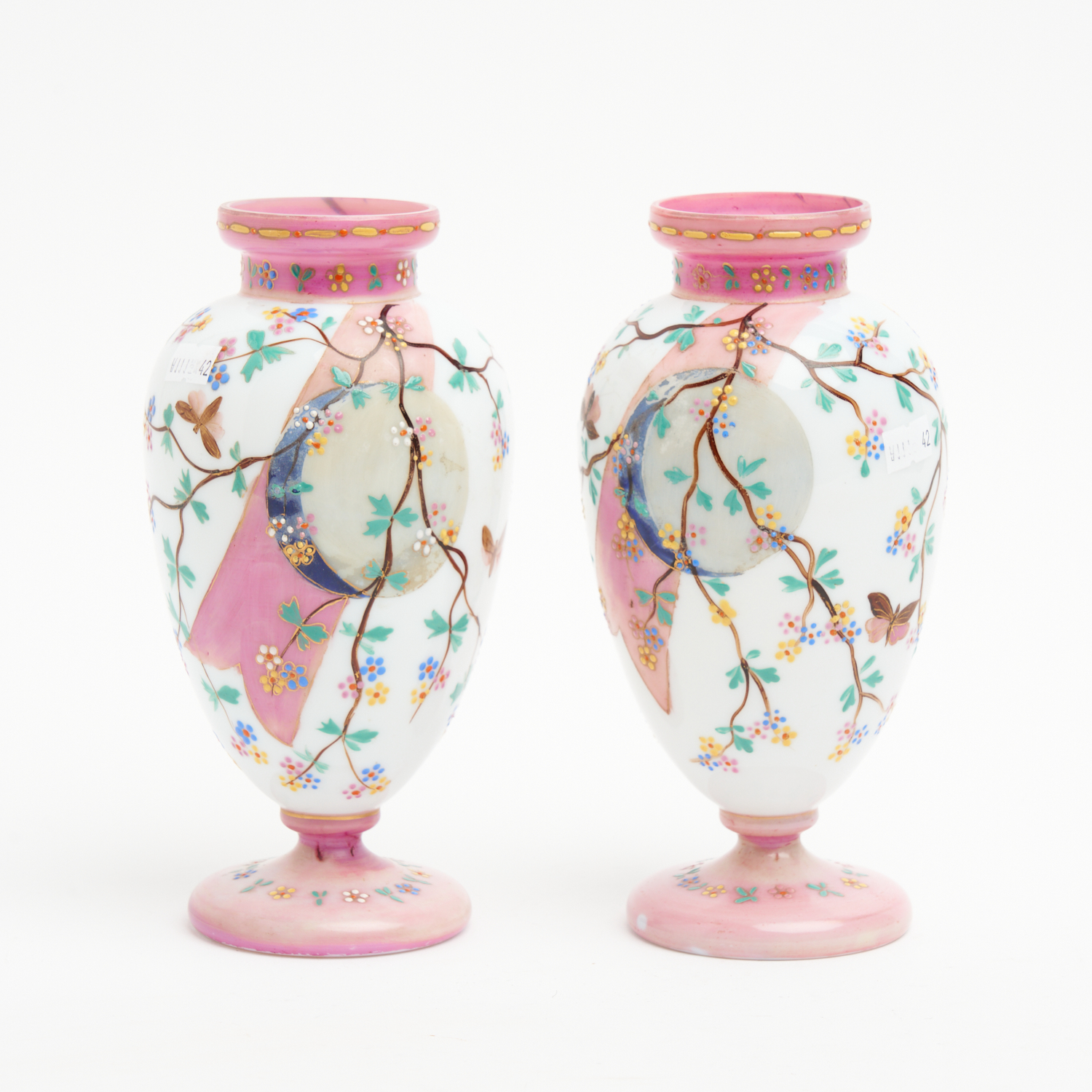 A PAIR OF ENAMEL DECORATED VASES ATTRIBUTED TO MOSER (A/F) H.21.5CM