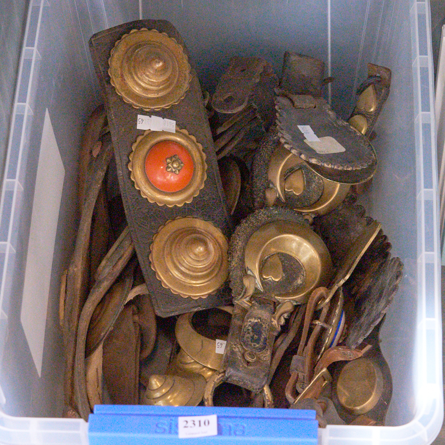 A LARGE COLLECTION OF 19TH AND EARLY 20TH CENTURY LEATHER AND BRASS HORSE HARNESS HORSE BRASSES