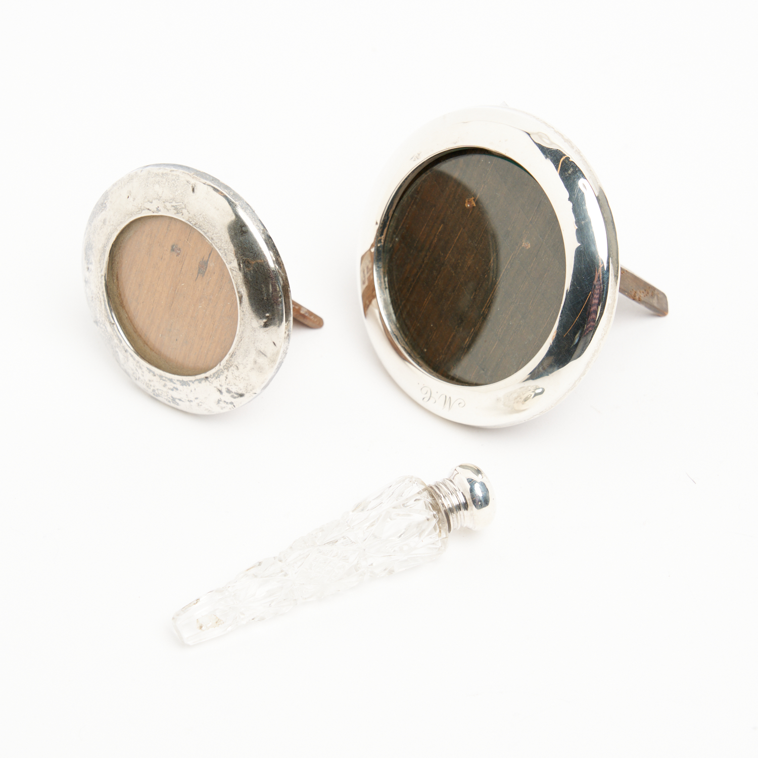 TWO HALLMARKED STERLING SILVER CIRCULAR FRAMES, WITH A LIDDED CUT CRYSTAL TAPERING FORM SCENT BOTTLE (A/F) DIA.7CM