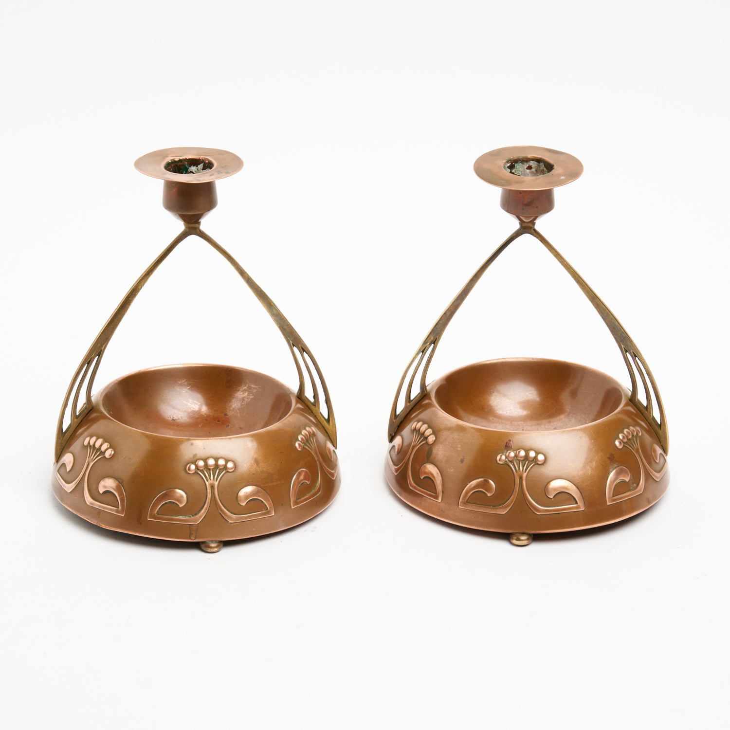 A PAIR OF ARTS AND CRAFTS COPPER AND BRASS CANDLESTICKS H.21CM