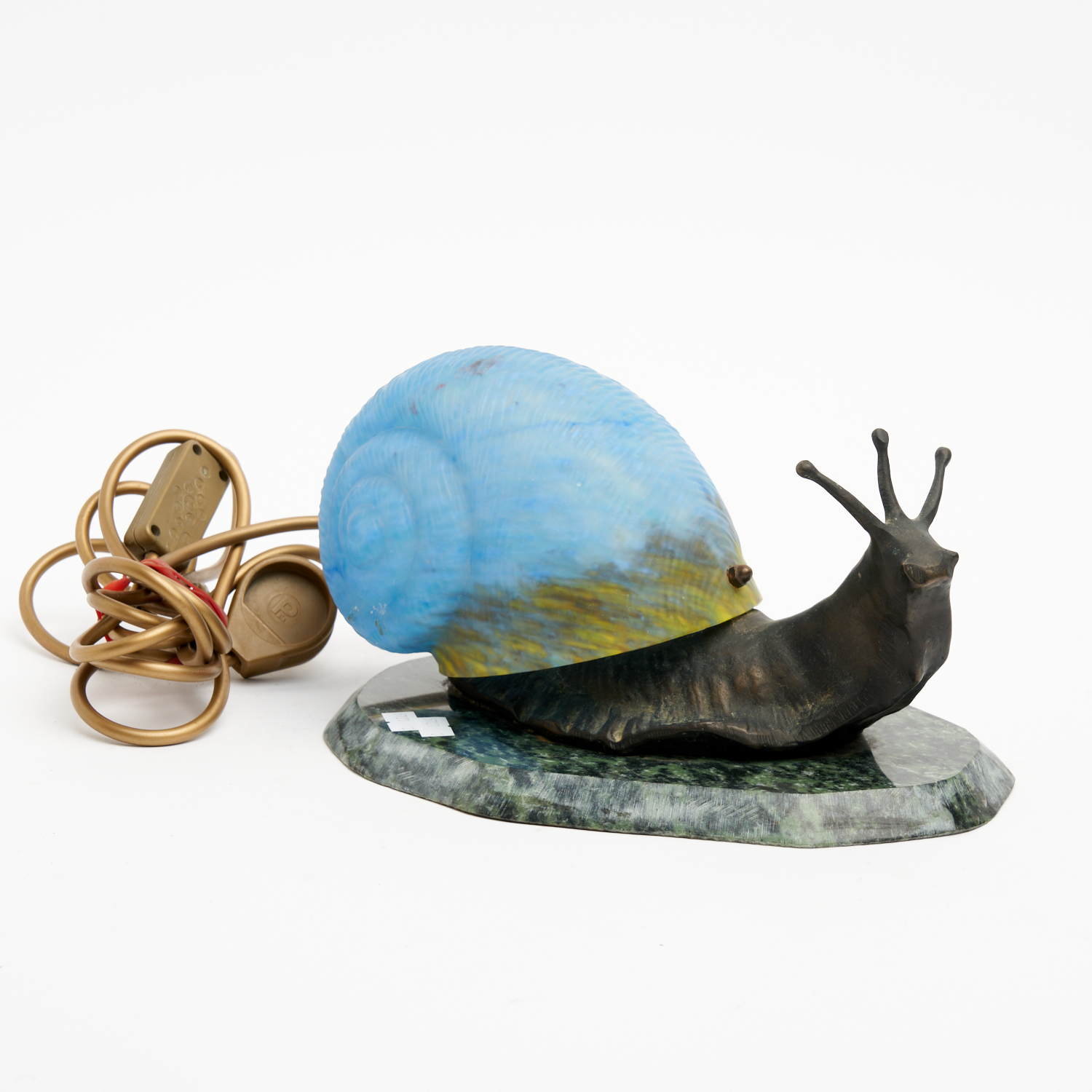 A 20TH CENTURY SNAIL LAMP, BRONZE WITH COLOURED GLASS ON MARBLE BASE L.27CM