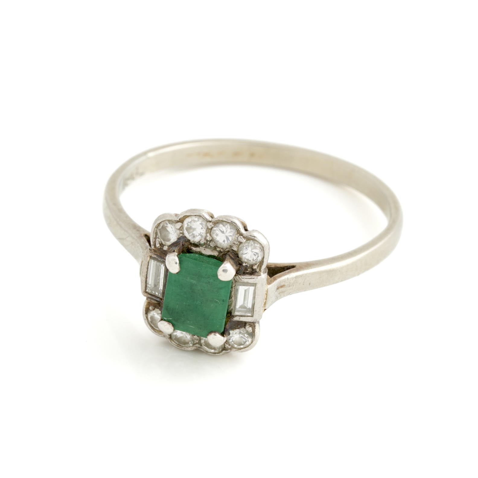 AN EMERALD AND DIAMOND RING IN 18CT WHITE GOLD, SIZE R, 3.02GMS