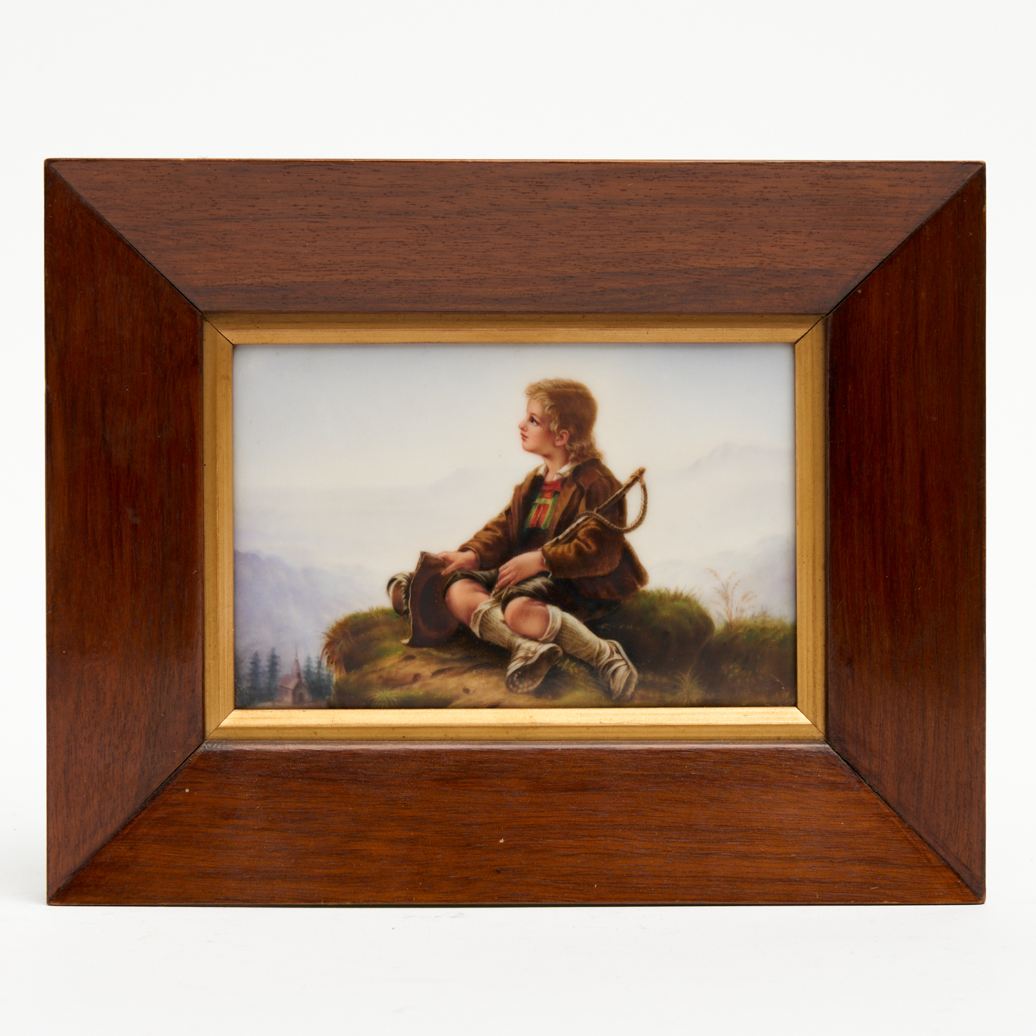A LATE 19TH CENTURY GERMAN PAINTED PORCELAIN PLAQUE DEPICTING A YOUNG SHEPHERD, AFTER FRIEDRICH DURCK, MOUNTED IN A HARDWOOD FRAME 18 X 22CM