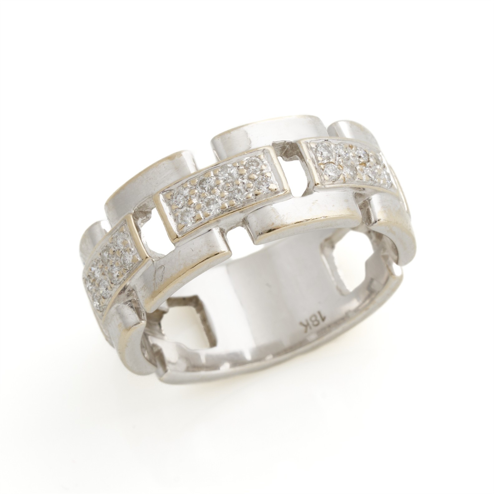 A GEOMETRIC DIAMOND RING IN 18CT WHITE GOLD, SIZE M 1/2, 7.48GMS