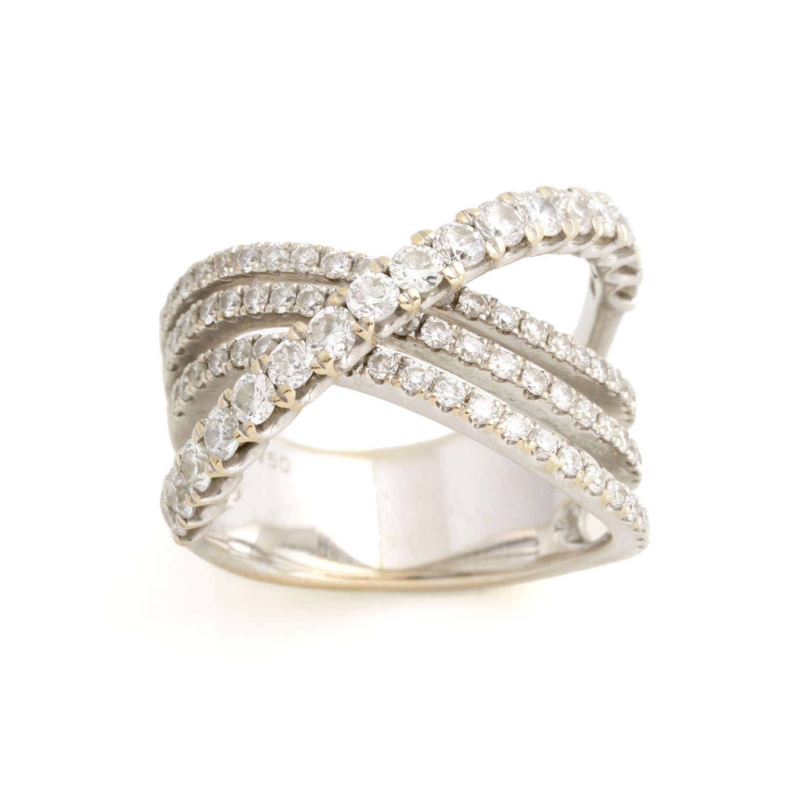 A DIAMOND CROSSOVER RING IN 18CT WHITE GOLD, SIZE M 1/2, 8.95GMS