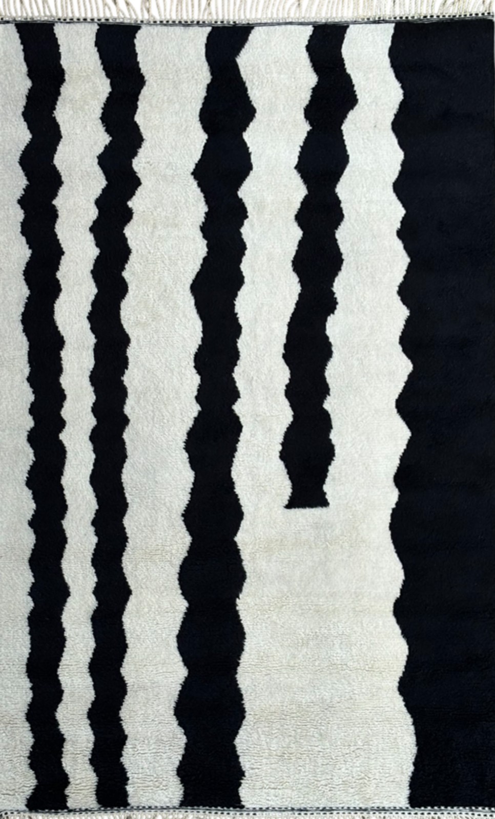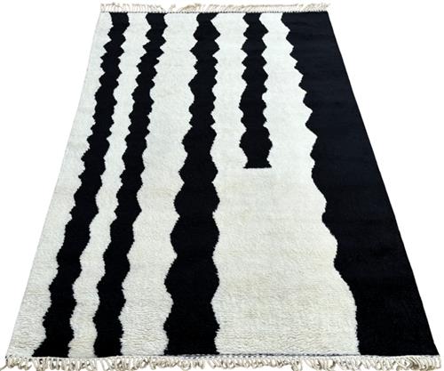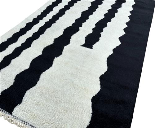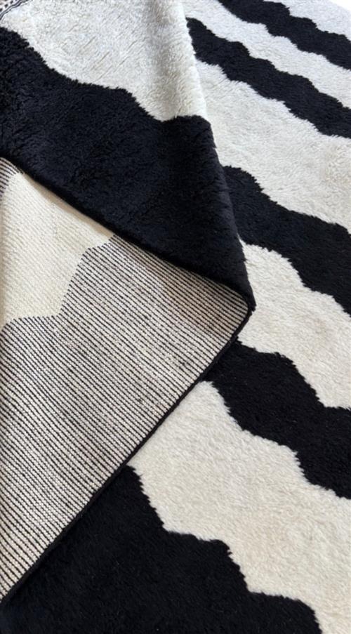 WOOLLEN WARP, WEFT & PILE. HAND-KNOTTED. SOFT PLUSH PILE IN WHITE WITH BLACK LINEAR WAVES THROUGHOUT.