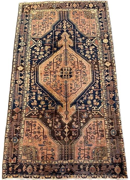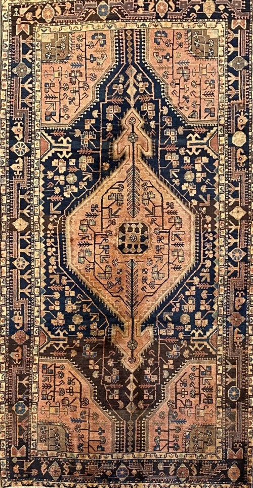 WOOL & VEGETABLE DYES WITH NATURAL ABRASH COLOUR VARIATION. HAND-KNOTTED VILLAGE WEAVE FROM THE HAMADAN REGION WITH A DISTINCT DESIGN OF CENTRAL HEXAGONAL ANCHORED MEDALLION CONTAINING FLORAL PATTERNS & CORNER MEDALLIONS IN AN INDIGO FIELD OF FLORAL PATTERNS. BORDER OF ROSETTES & GEOMETRIC PATTERNS.