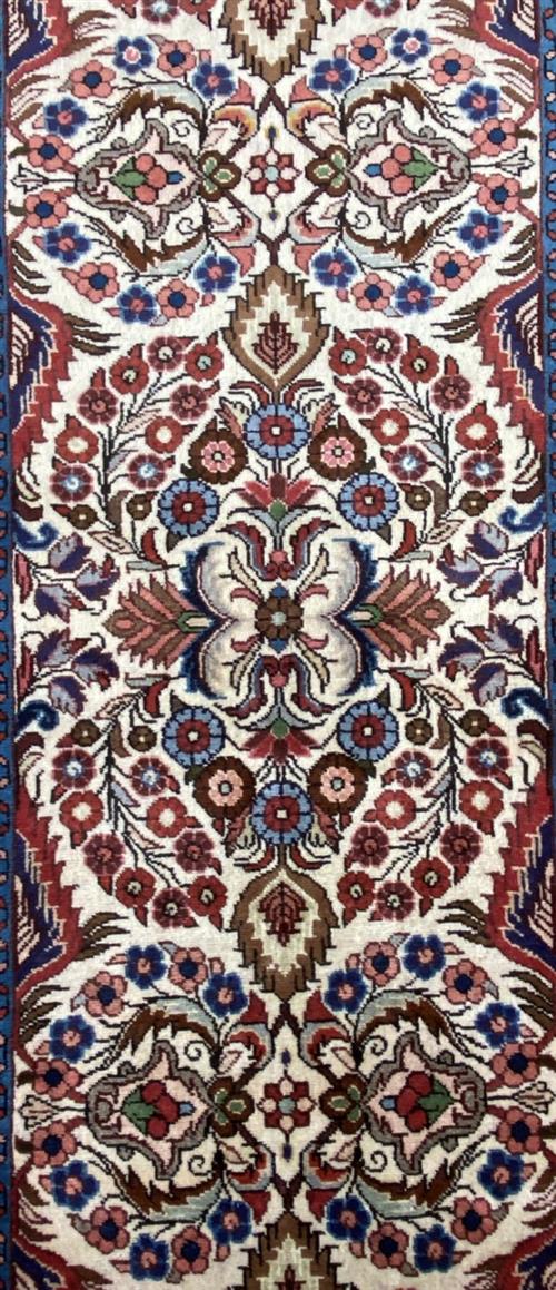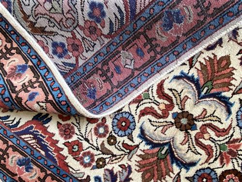 WOOLLEN PILE. HAND-KNOTTED WEAVE OF 450,000 KNOTS PER SQUARE METER FROM THE HAMADAN PROVINCE WITH TRADITIONAL DESIGN OF REPEATING MEDALLIONS OF FLORAL SPRAYS WITHIN A CREAM FIELD. BORDER OF FLOWER HEADS.