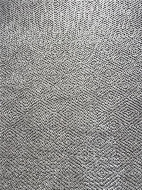 WOOLLEN PILE. HANDMADE WEAVE WITH ALL-OVER EMBOSSED DIAMOND-SHAPED PATTERNS IN A BISCUIT SHADE.