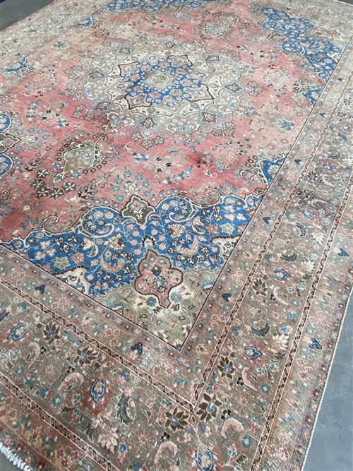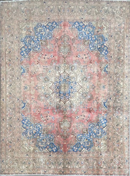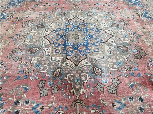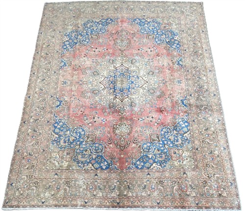 WOOL PILE. HAND-KNOTTED CITY WEAVE FROM THE NORTH-EASTERN KHORASAN PROVINCE WITH CLASSIC DESIGN OF A BOLD FLORAL MEDALLION & QUARTERED CORNER MEDALLIONS OVER-DYED IN PASTEL SHADES OF RED, PERSIAN & BABY BLUE & BROWN.