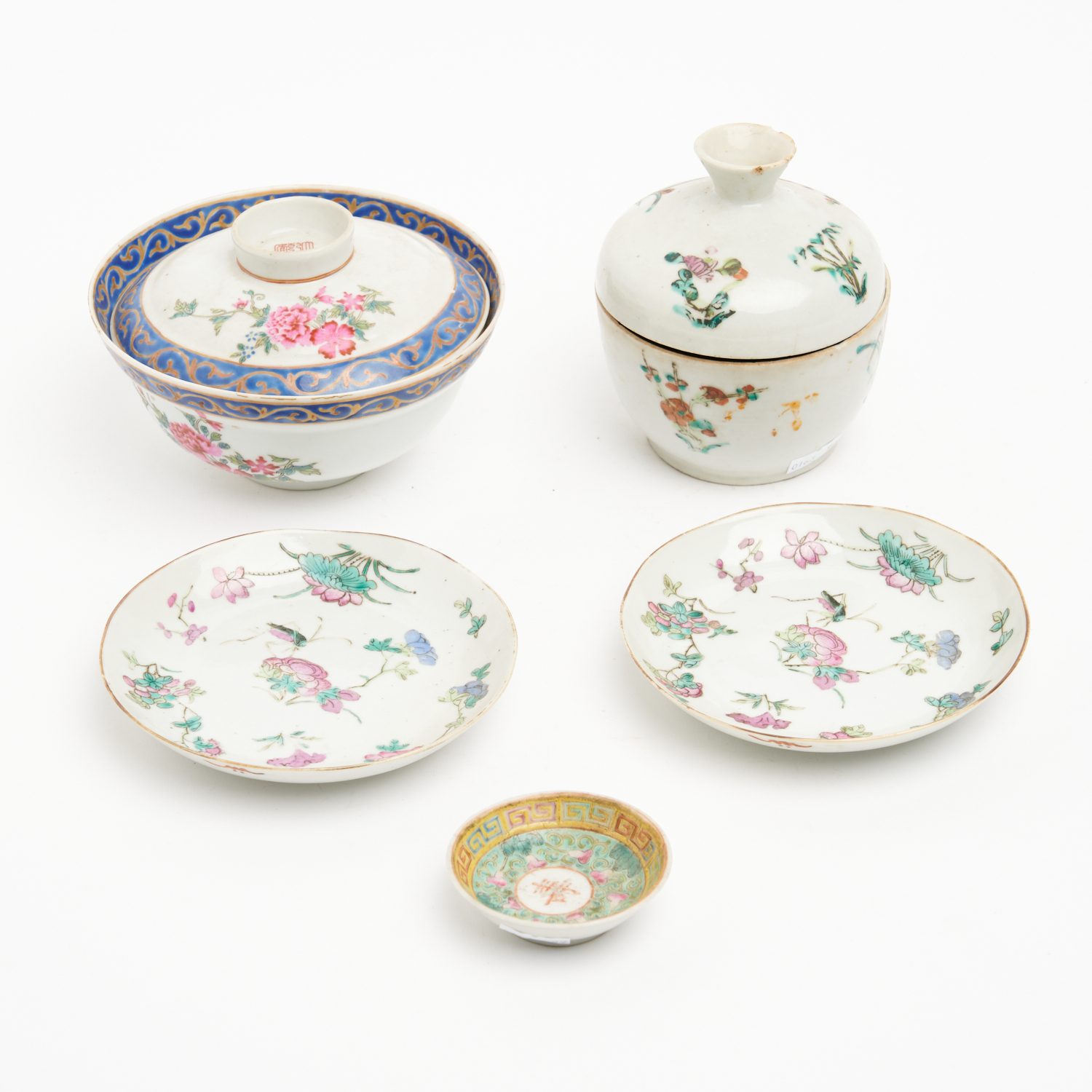 A COLLECTION OF CHINESE FAMILLE ROSE PORCELAIN INCLUDING TWO COVERED BOWLS, AND THREE DISHES (A/F) DIA.14CM