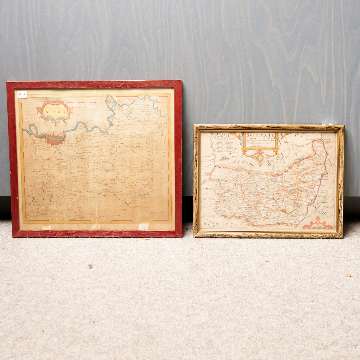 TWO FRAMED ANTIQUE MAPS INCLUDING SUFFOLK BY CHRISTOPHER SAXTON AND MIDDLESEX BY ROBERT MODERN