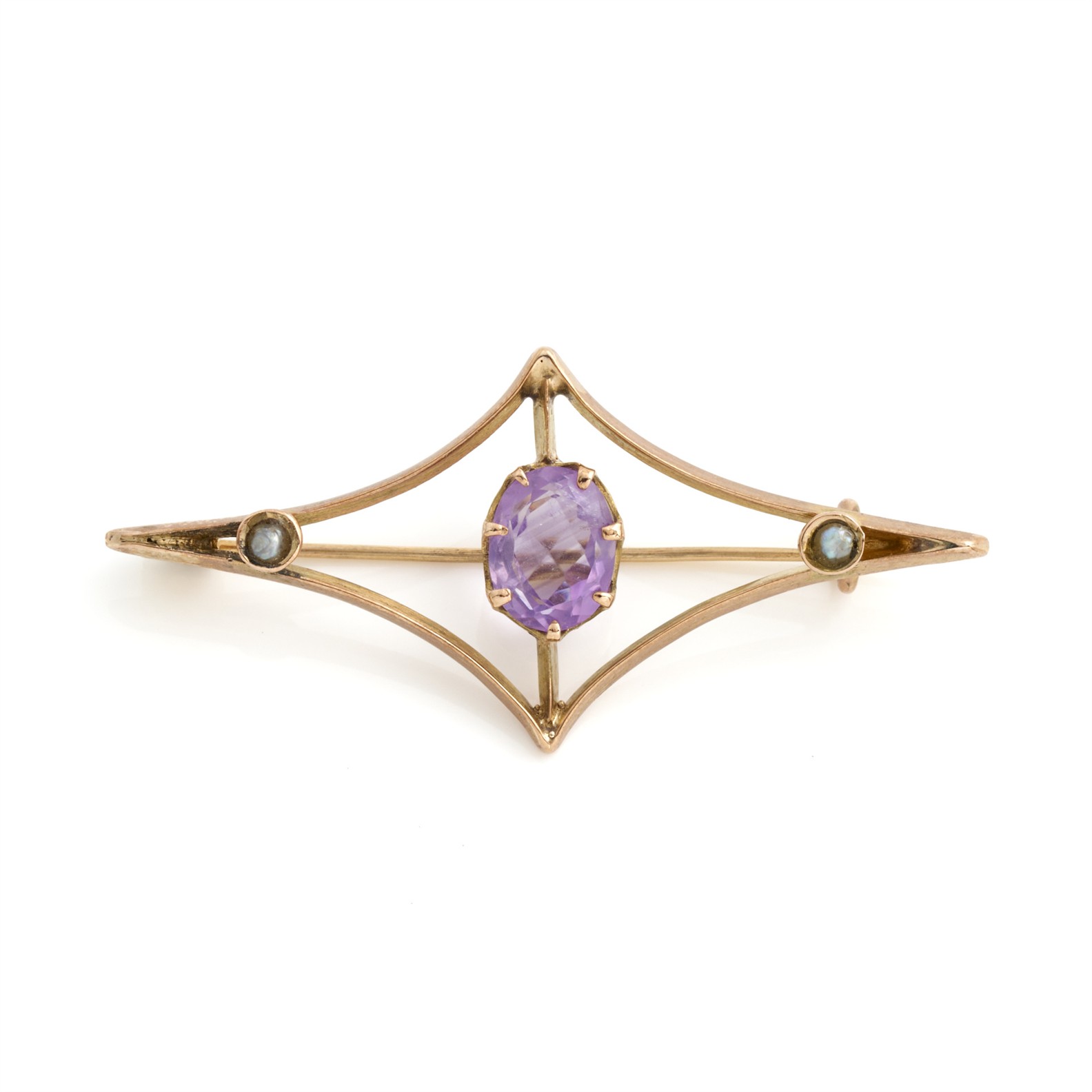 AN EDWARDIAN AMETHYST AND SEED PEARL BROOCH IN 9CT GOLD, 45MM X 20MM, 2.16GMS
