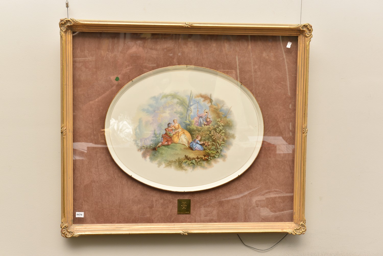 Oval shaped, with a nicely painted Wattesque scene (unsigned), above a gilded metal plaque with engraved interlaced 'L's enclosing an 'A'/Anno: 1753, presented in a velvet lined giltwood frame