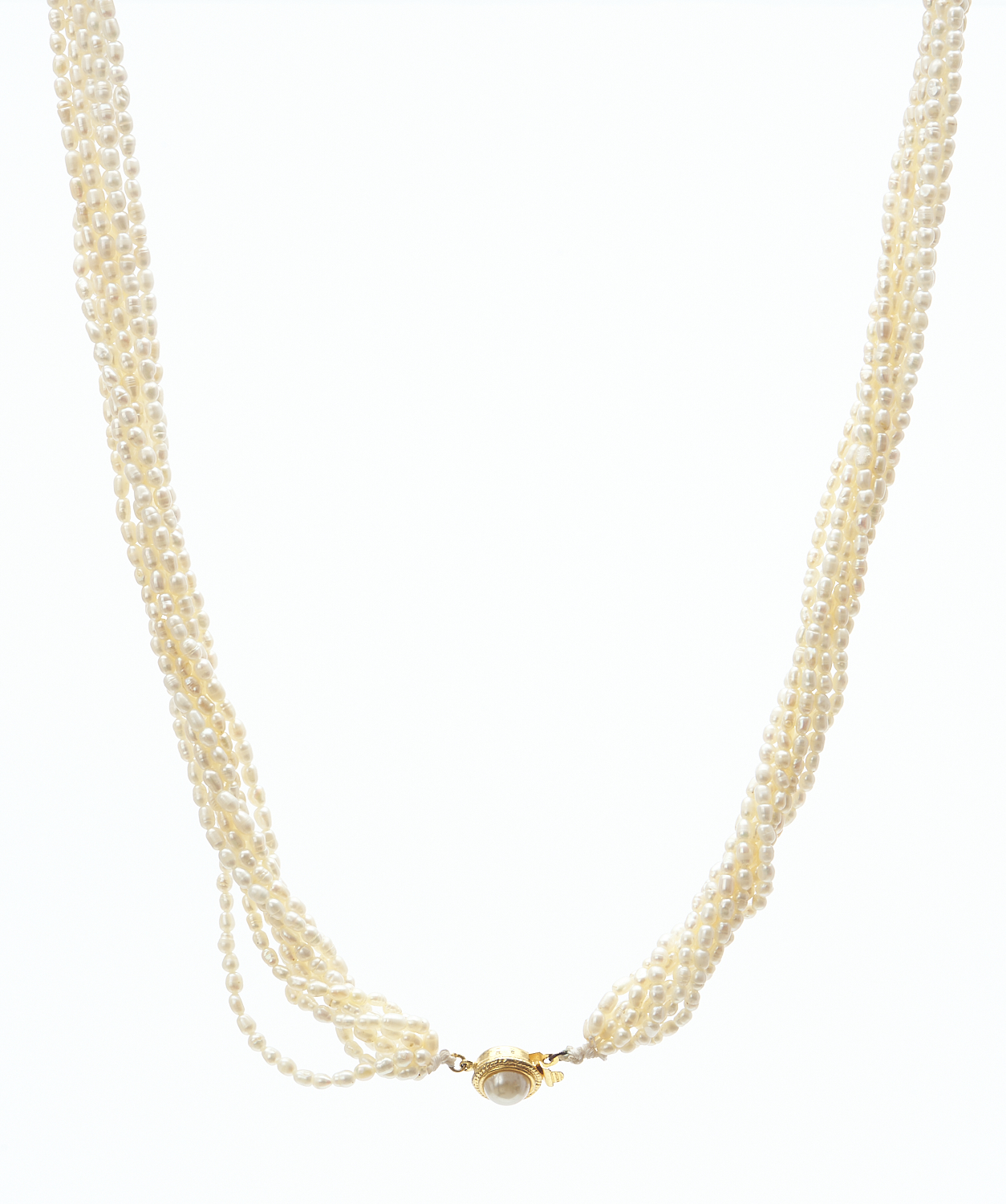 A MULTI STRAND SEED PEARL NECKLACE Comprising eight strands of oval seed pearls, to a faux mabé pearl gold tone clasp, total length 620mm.