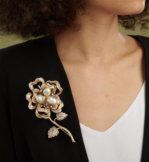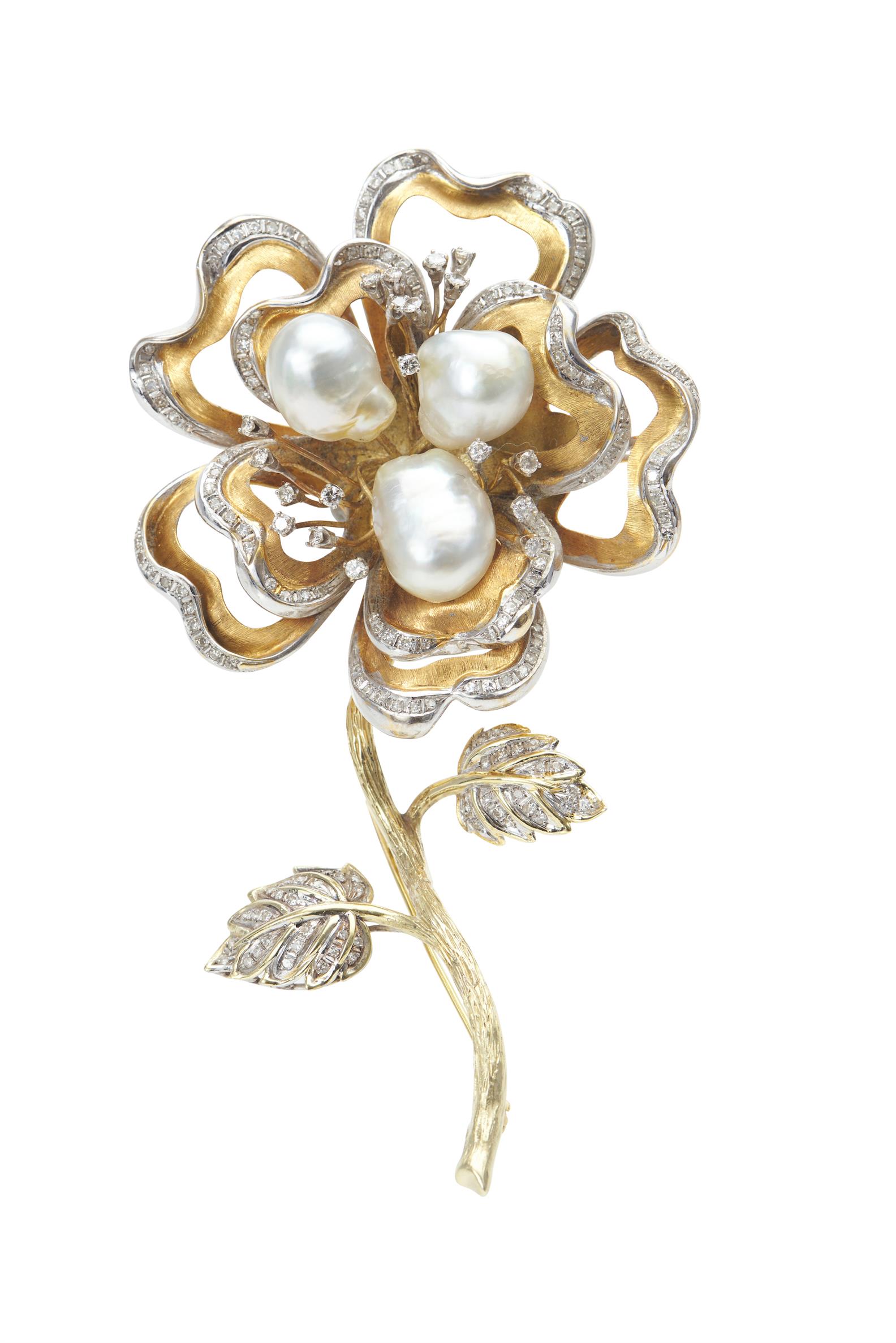A SOUTH SEA PEARL AND DIAMOND FLOWER BROOCH The large flower featuring three central baroque pearls of silver white hues, within diamond set stamen and petals, on a detachable stem with diamond set leaves, in two tone 18ct gold.