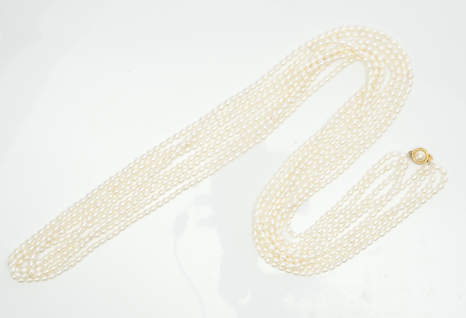 A MULTI STRAND FRESHWATER PEARL NECKLACE Comprising four strands of oval freshwater pearls, to a faux mabé pearl gold tone clasp, total length 1,160mm.